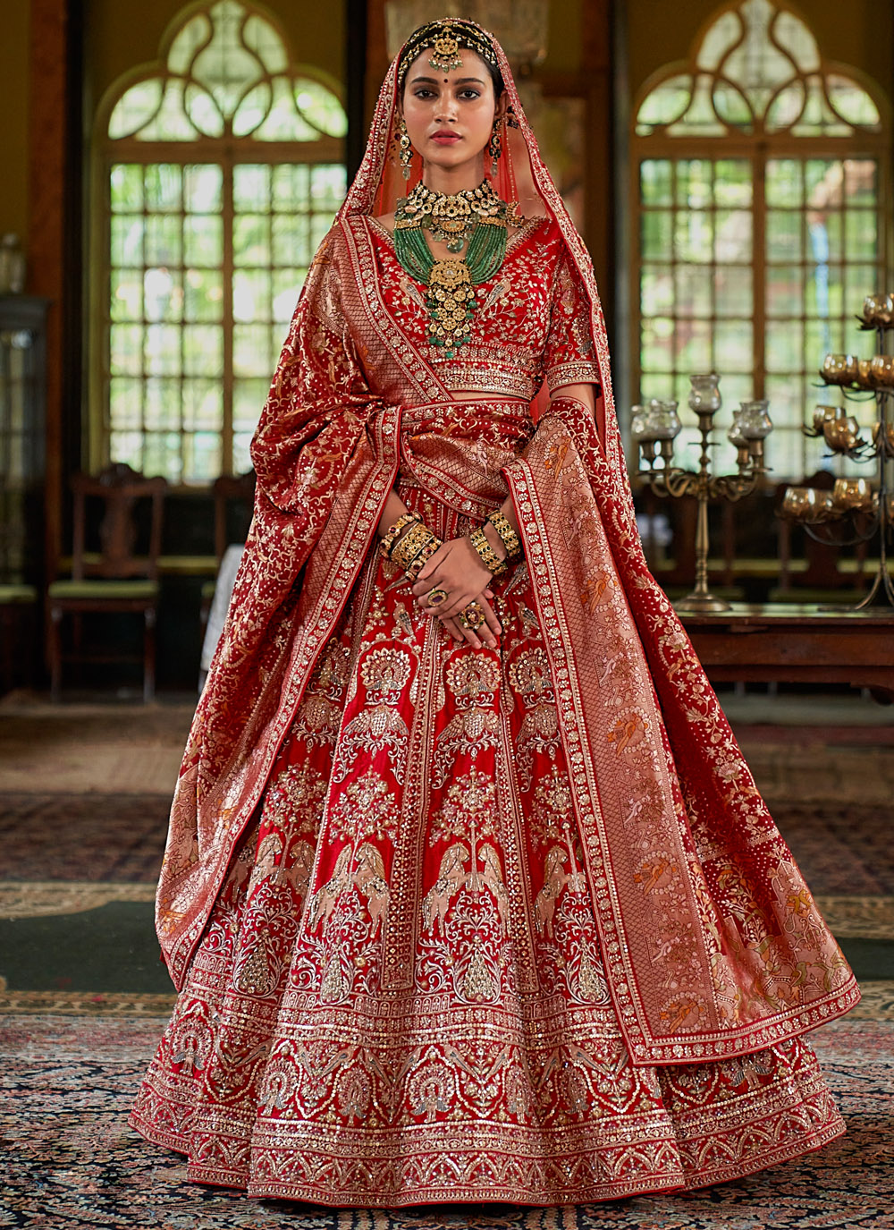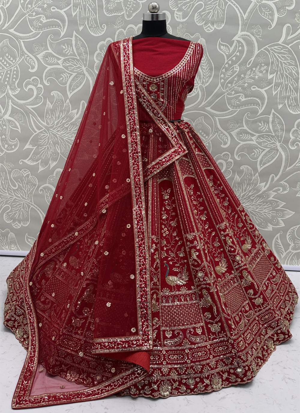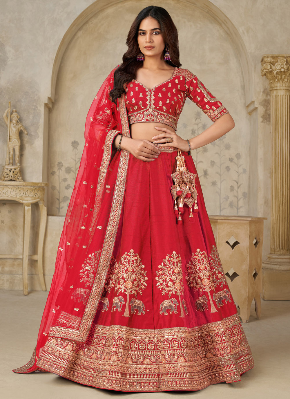 Silk Red Sequins Thread Zari Lace Embroidered Lehenga Choli for Wedding