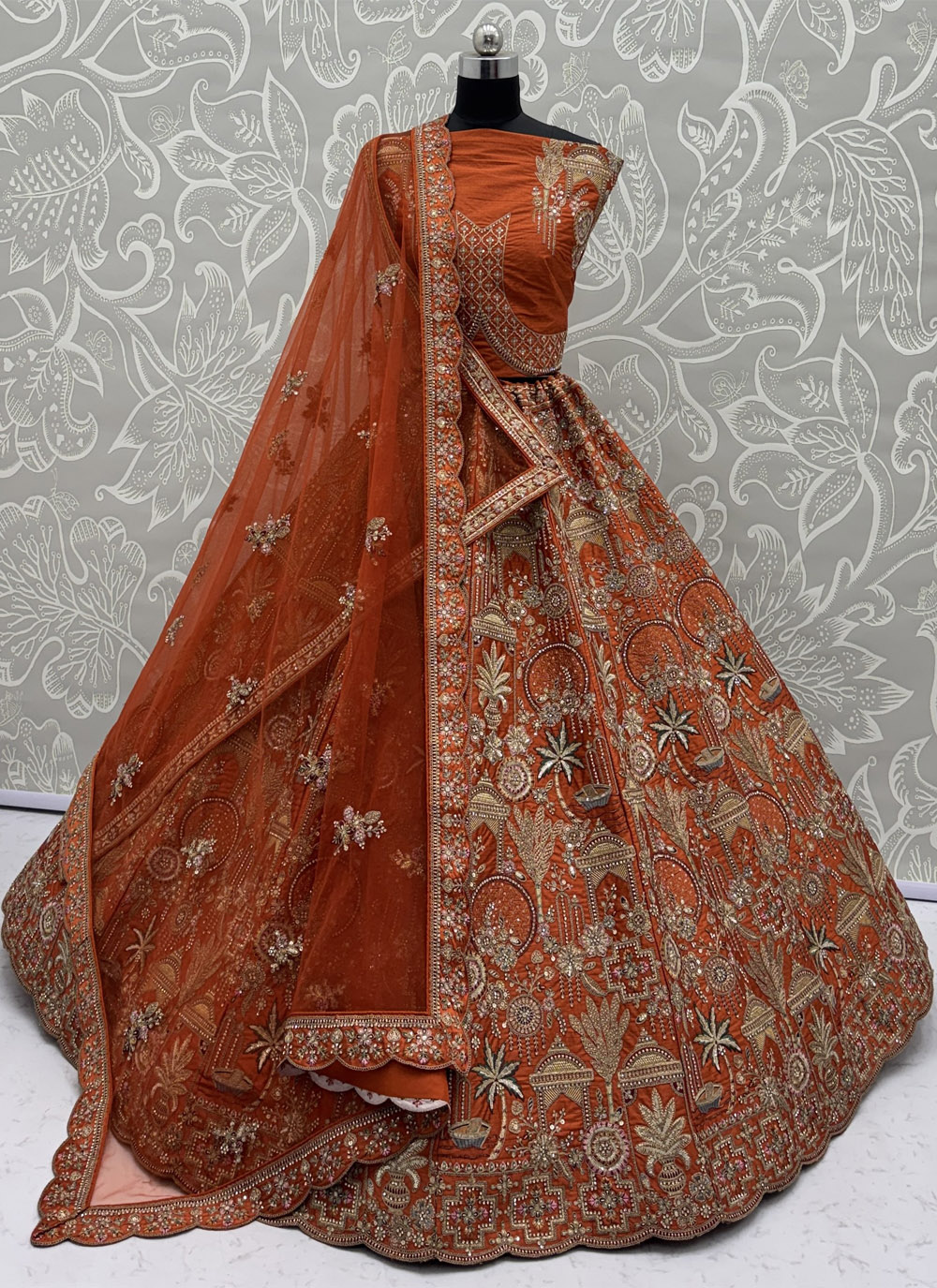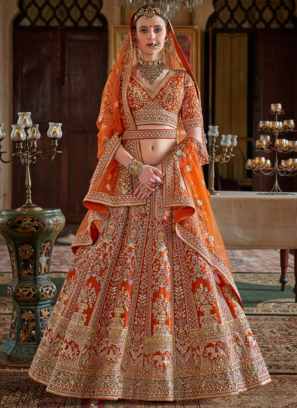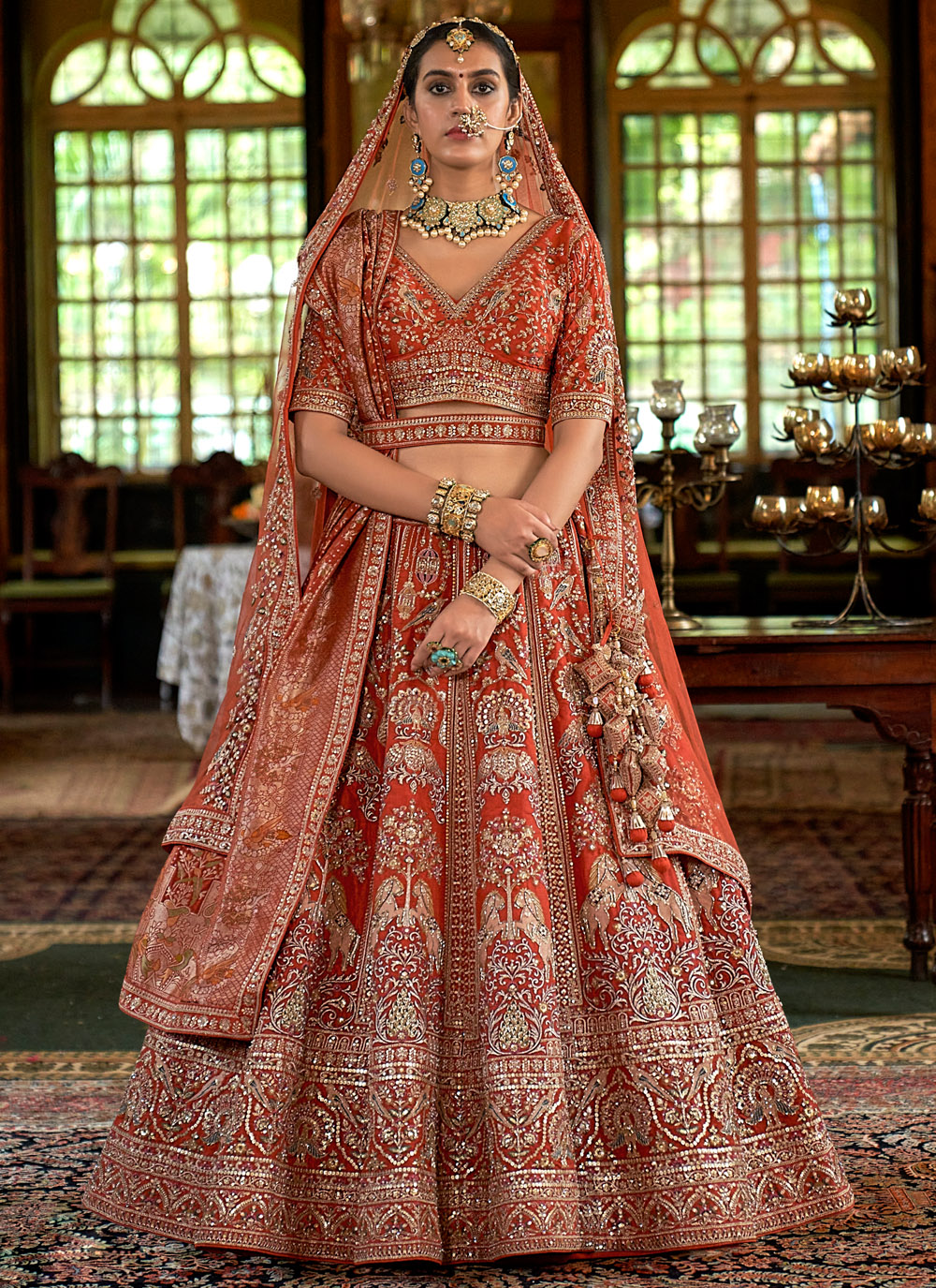 Orange Silk Dori Sequins Zari Thread Embroidered Lehenga Choli for Wedding