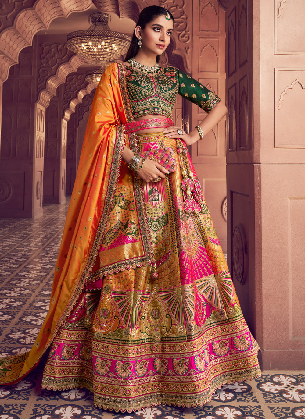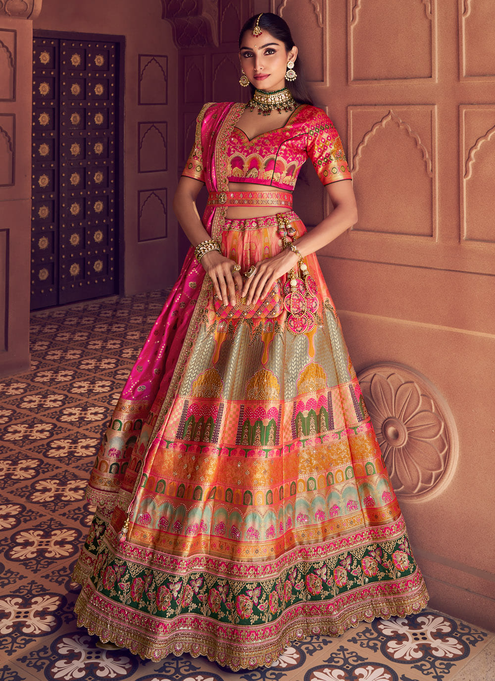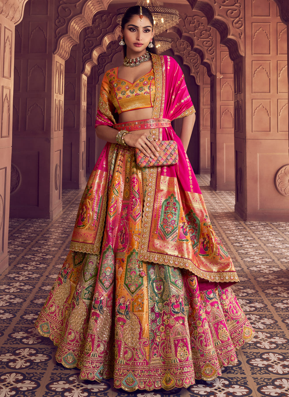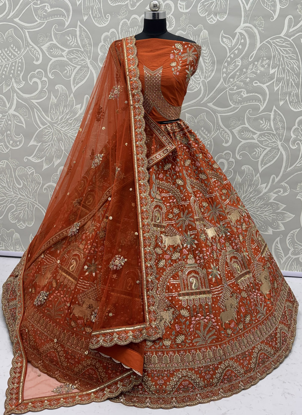 Orange Silk Dori Sequins Zari Thread Embroidered Lehenga Choli for Wedding