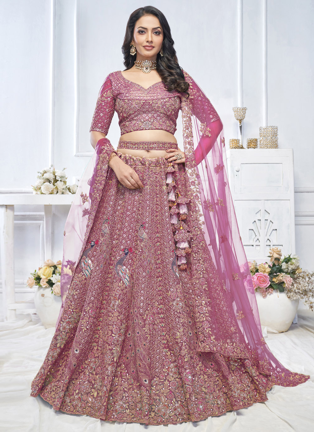 Hot Pink Silk Lehenga Choli with Embroidered Sequins Pearls Stone and Zari Work for Wedding