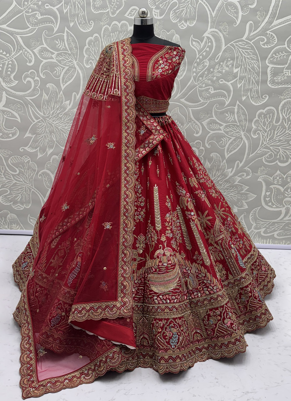 Red Silk Sequins Dori Multi Thread Zari Embroidered Bridal Lehenga Choli