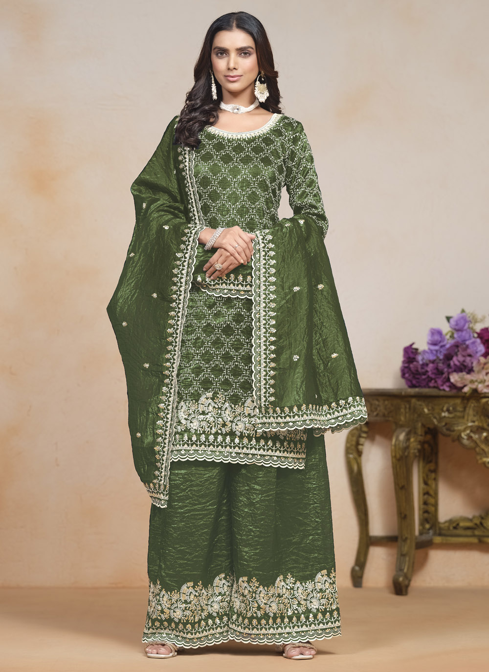 Embroidered and Sequins Work Crush Green Salwar Suit