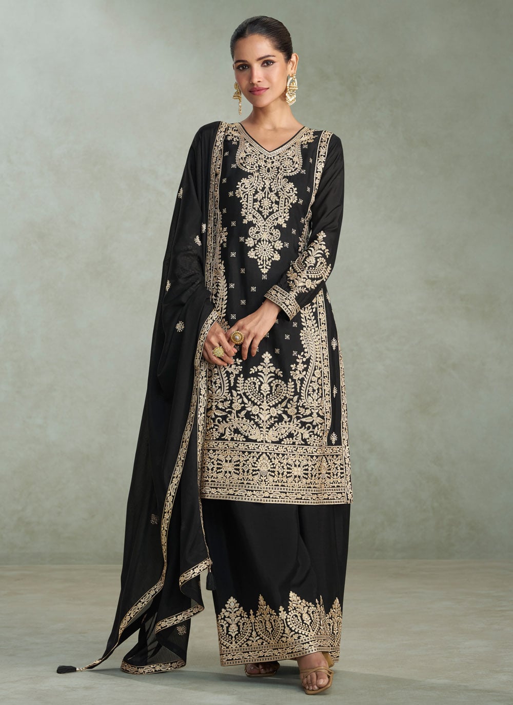 Black Chinon Zari and Embroidered Readymade Salwar Suit