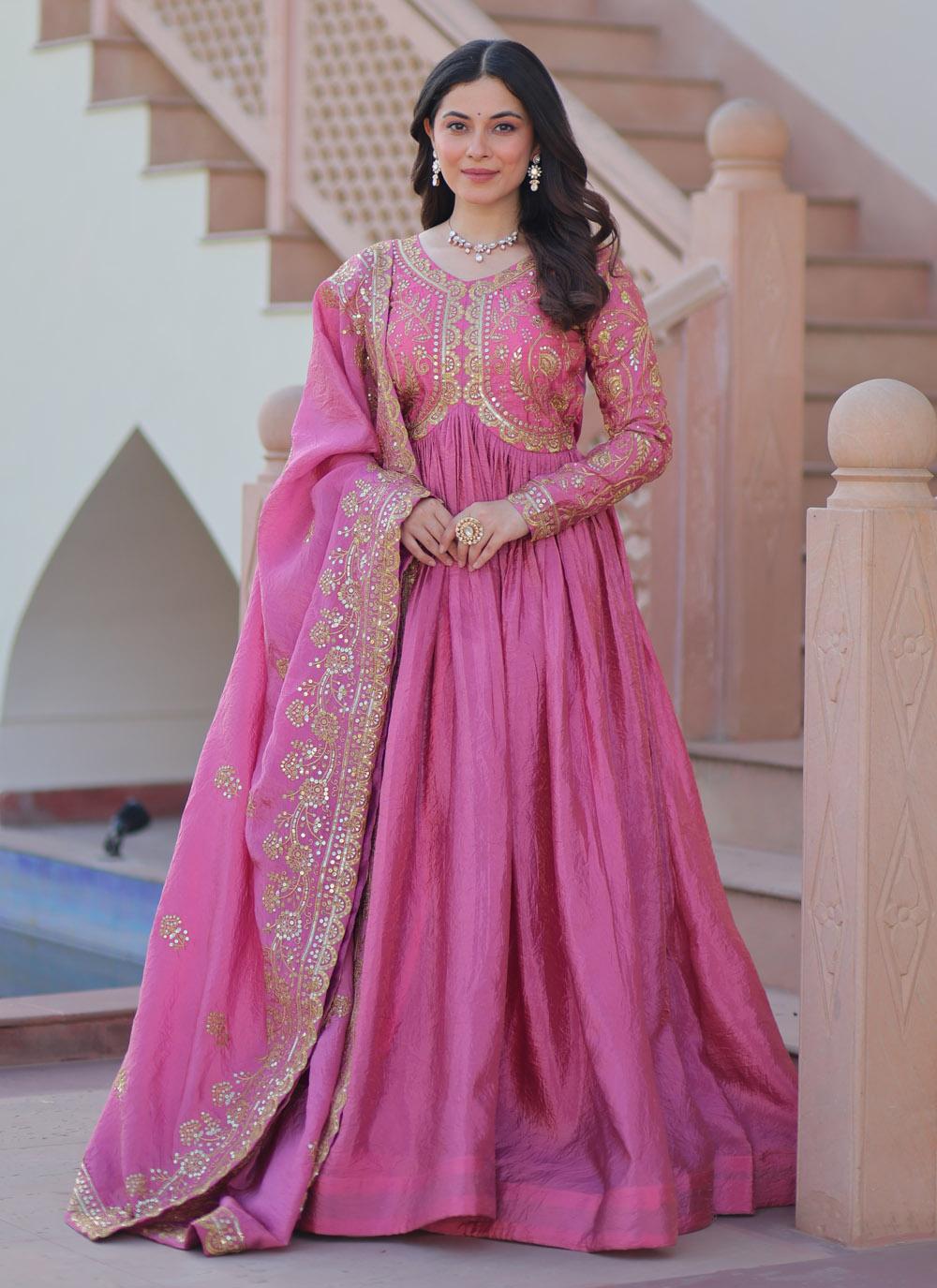 Pink Georgette Zari Sequins Embroidered Readymade Gown