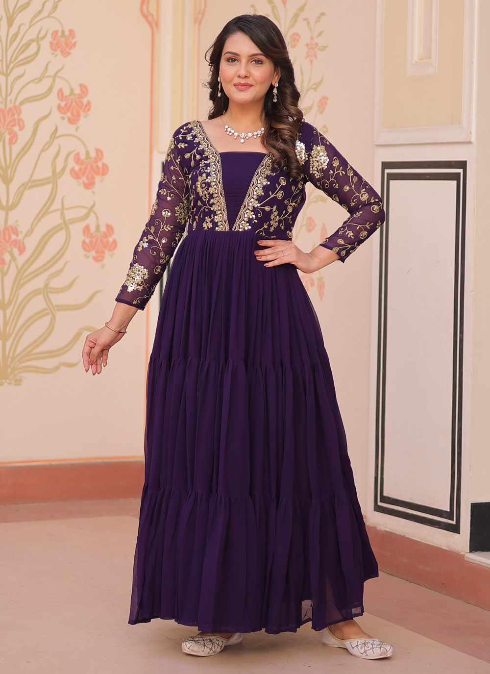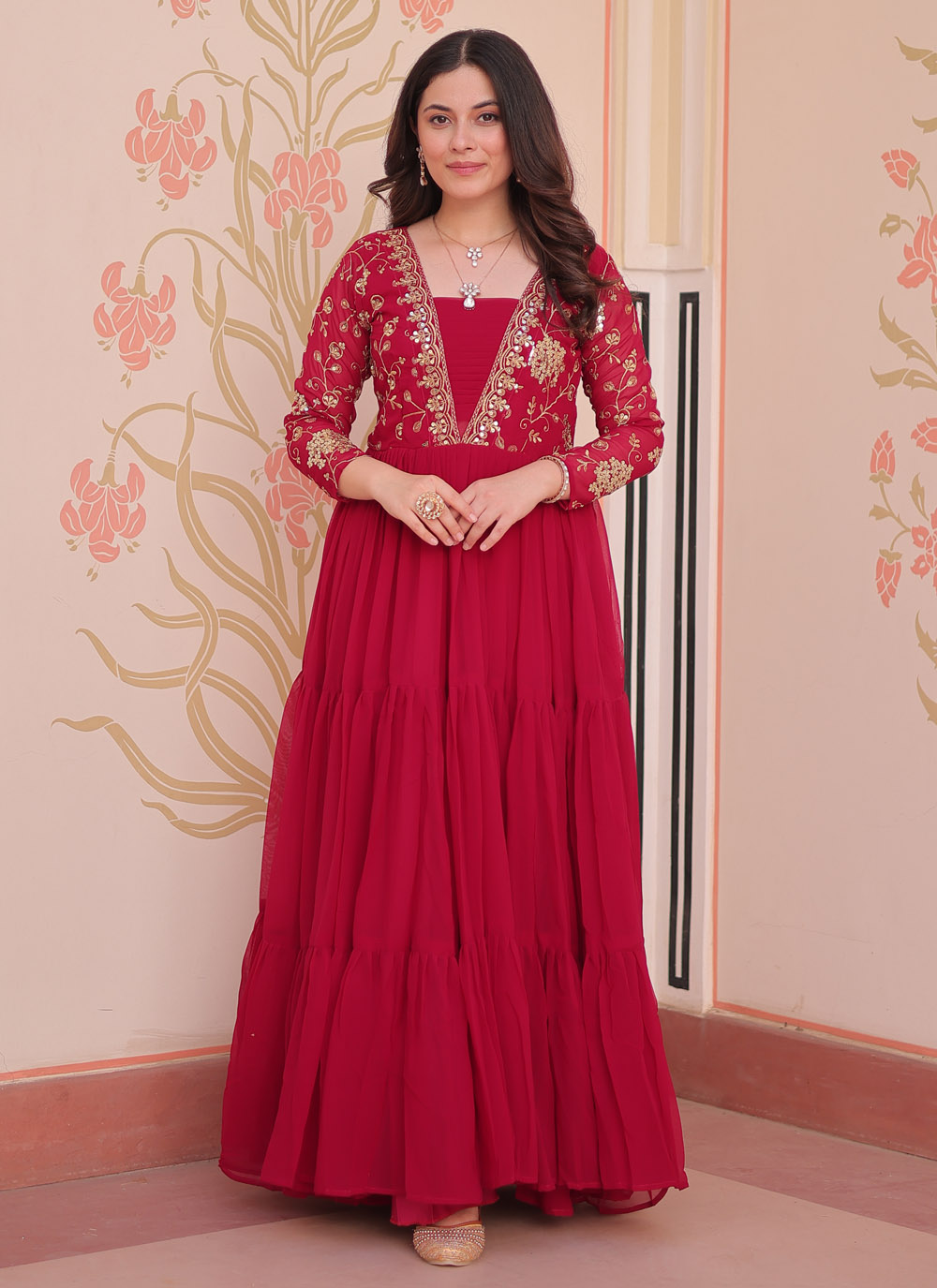 Wine Faux Georgette Beads Embroidered Readymade Gown