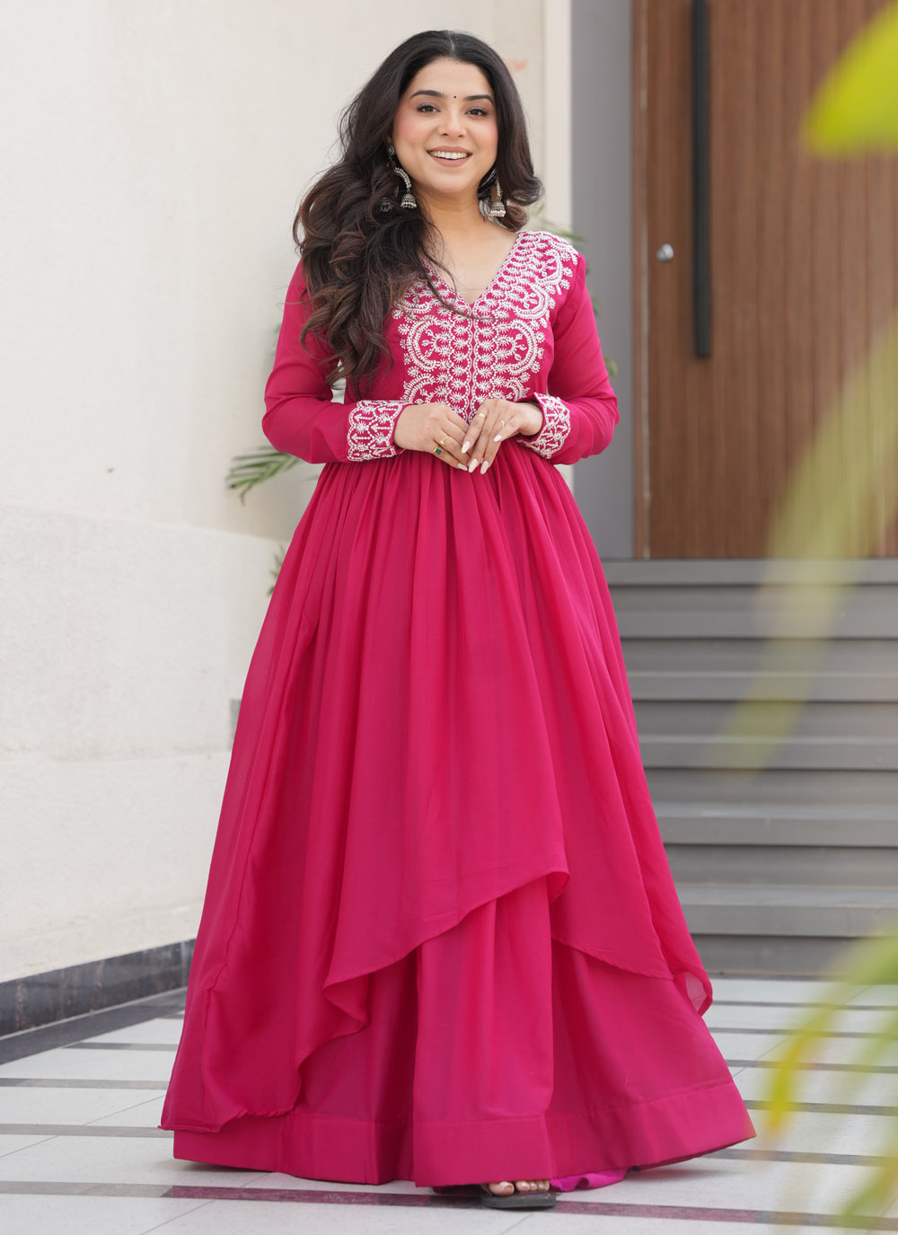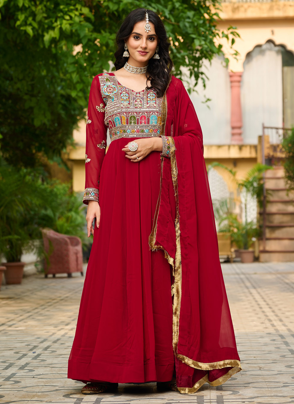 Embroidered Maroon Faux Georgette Readymade Gown