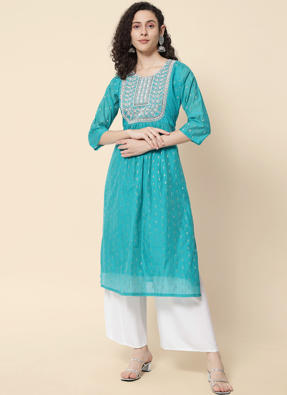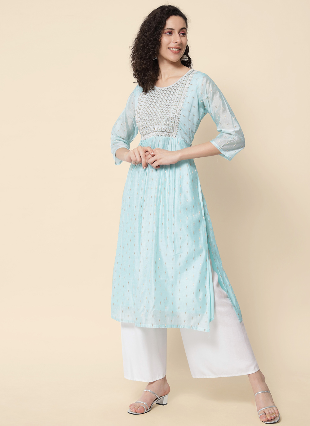 Aqua Blue Embroidered Chanderi Trendy Casual Kurti