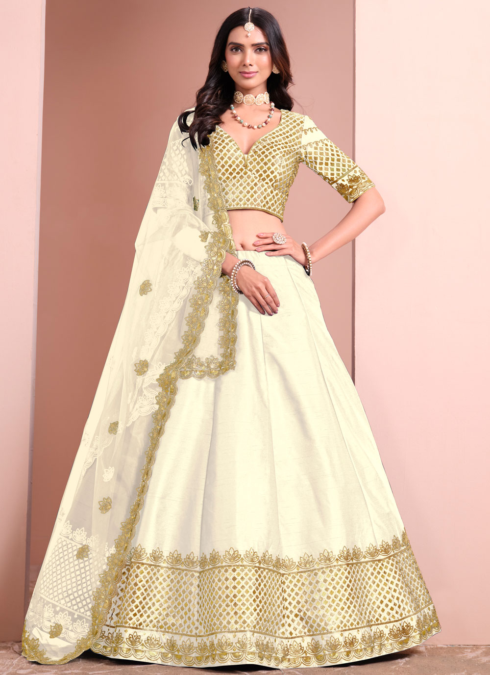 Off White Art Silk Embroidered Sequins Work Lehenga Choli