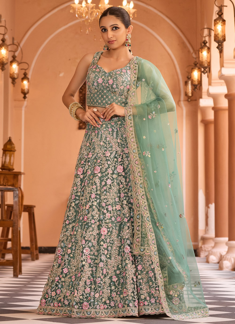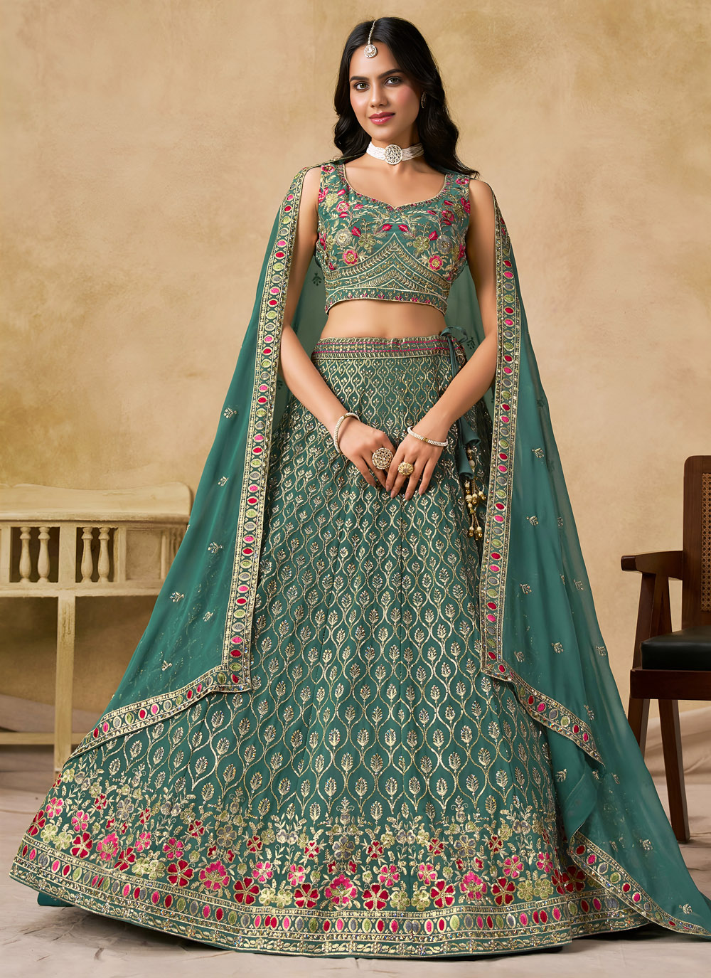 Silk Sequins Thread Embroidered Designer Lehenga Choli in Teal