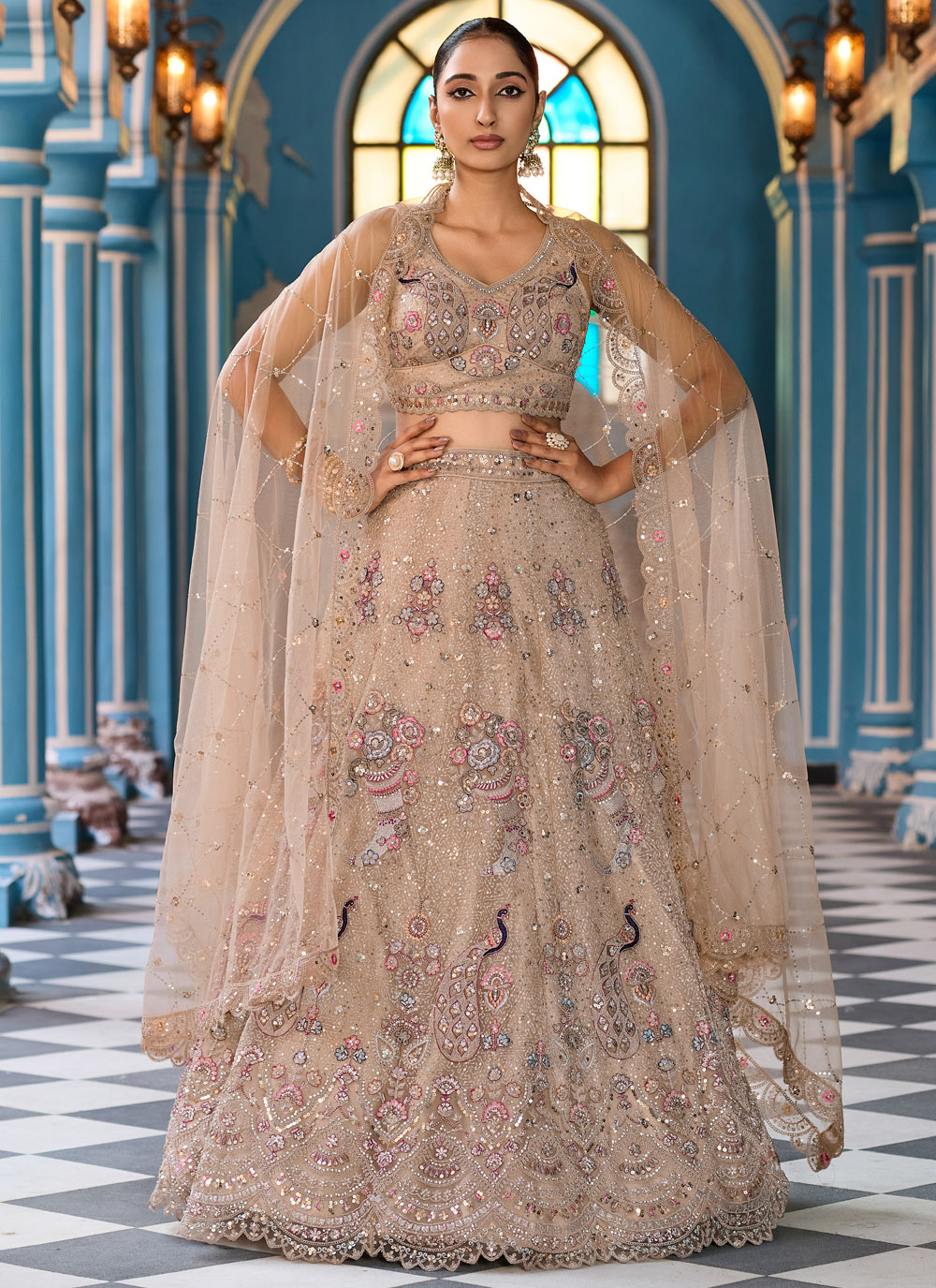 Cream Sequins Thread Pearls Embroidered Silk Lehenga Choli for Ceremonial