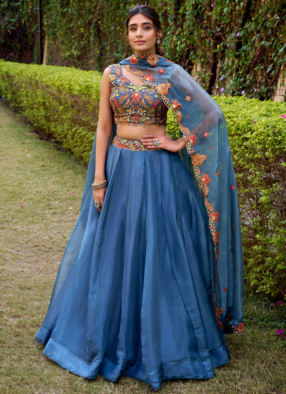 Organza Aqua Blue Zari Sequins Embroidered Trendy Lehenga Choli