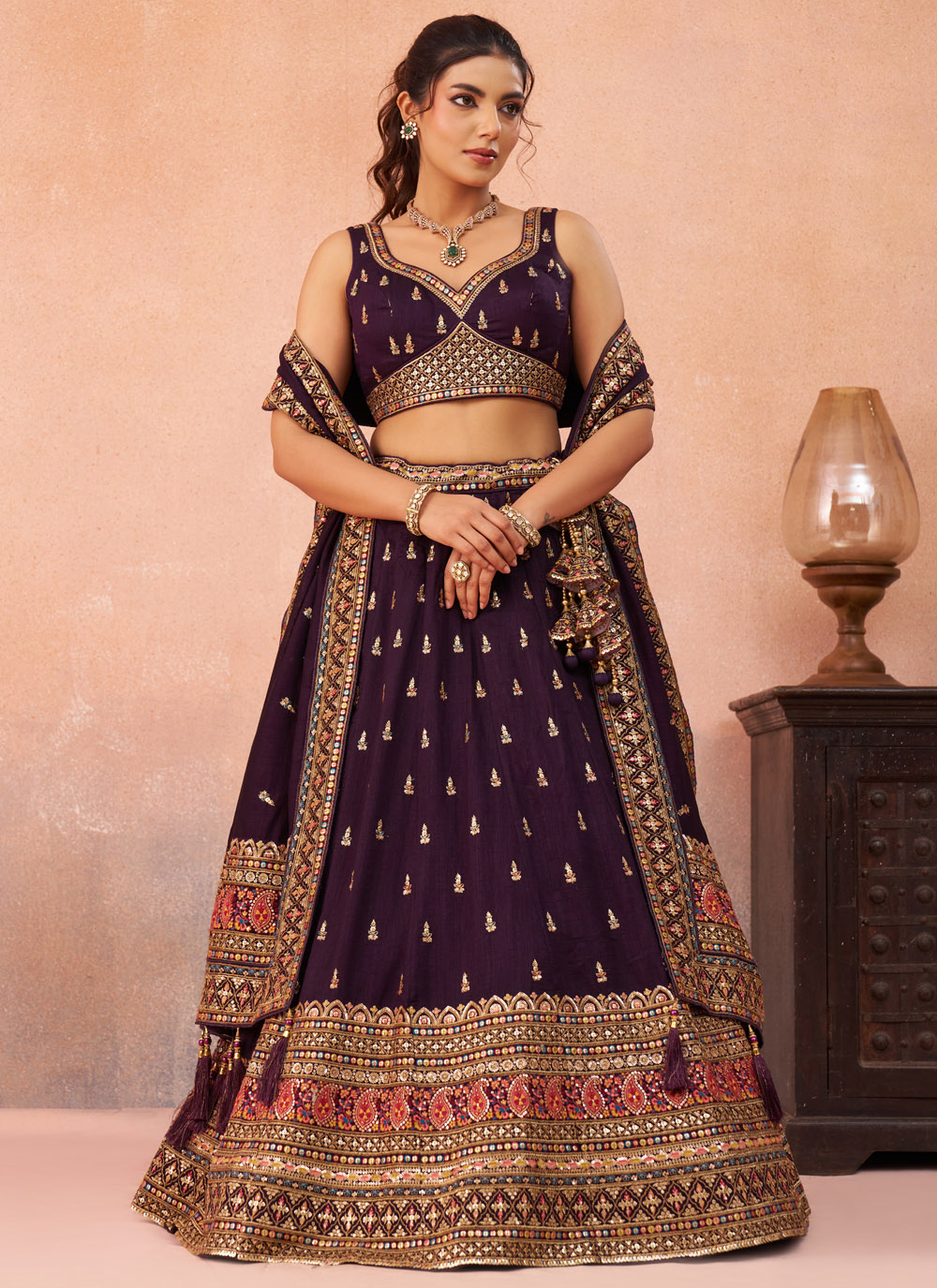 Net Purple Thread Zarkan Sequins Dori Embroidered Engagement Lehenga Choli