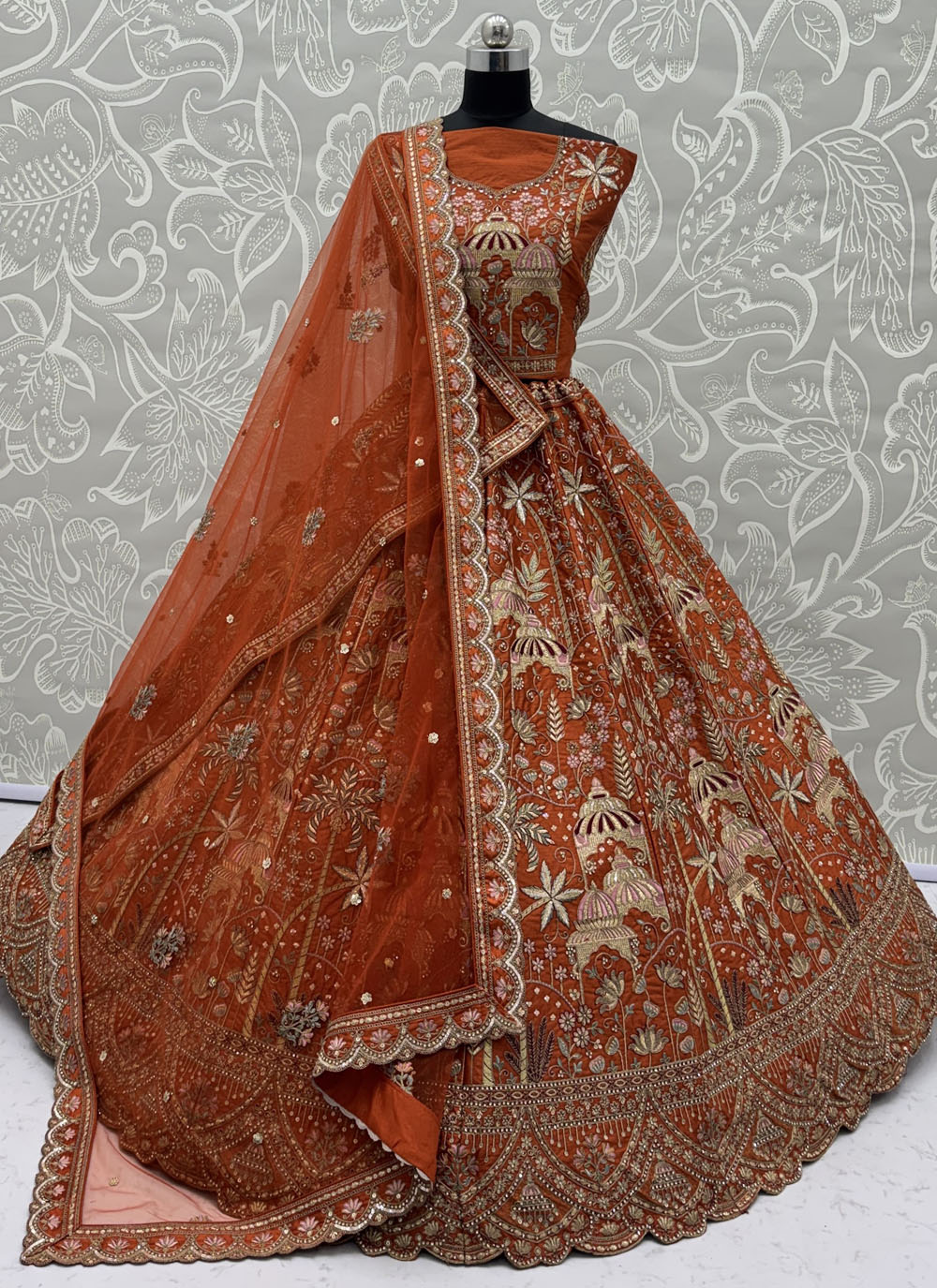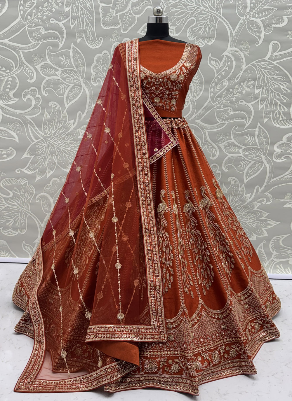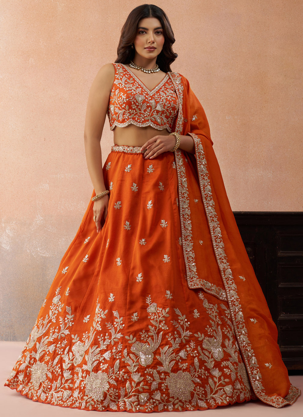 Orange Silk Dori Sequins Zari Thread Embroidered Lehenga Choli for Wedding
