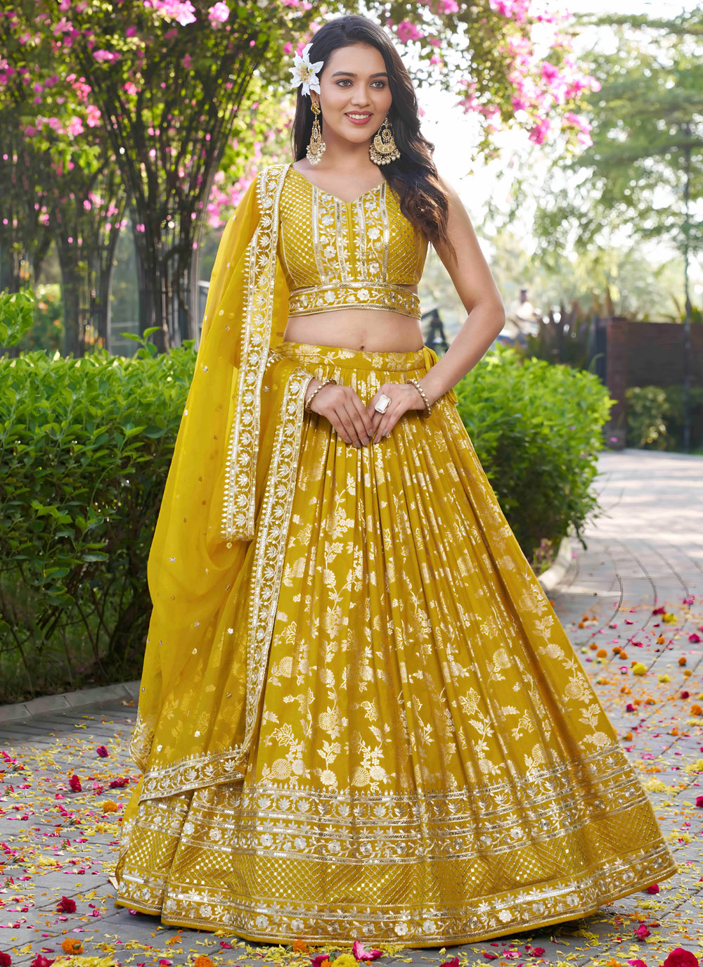 Organza Sequins Thread Embroidered Yellow Readymade Lehenga Choli for Ceremonial