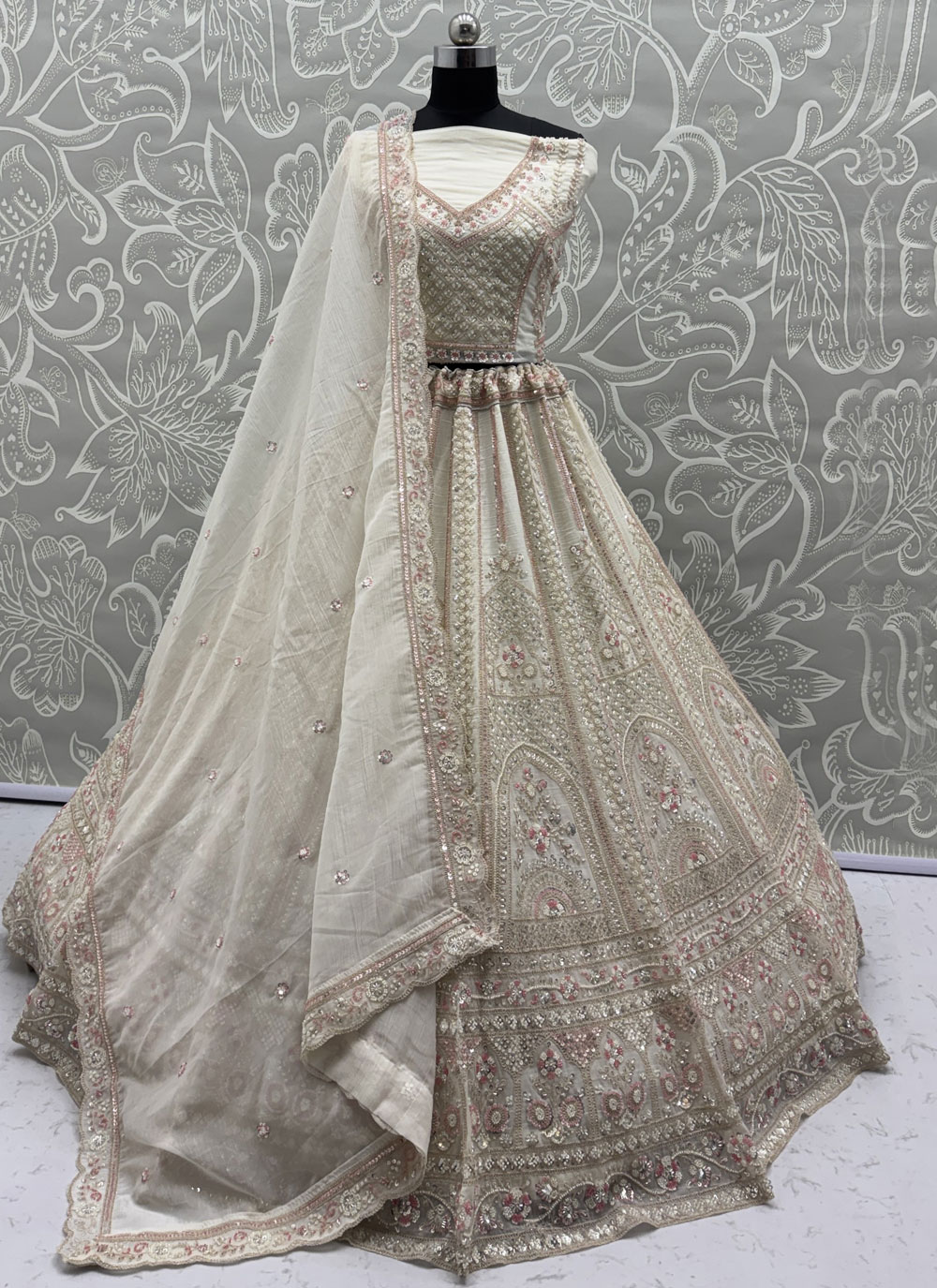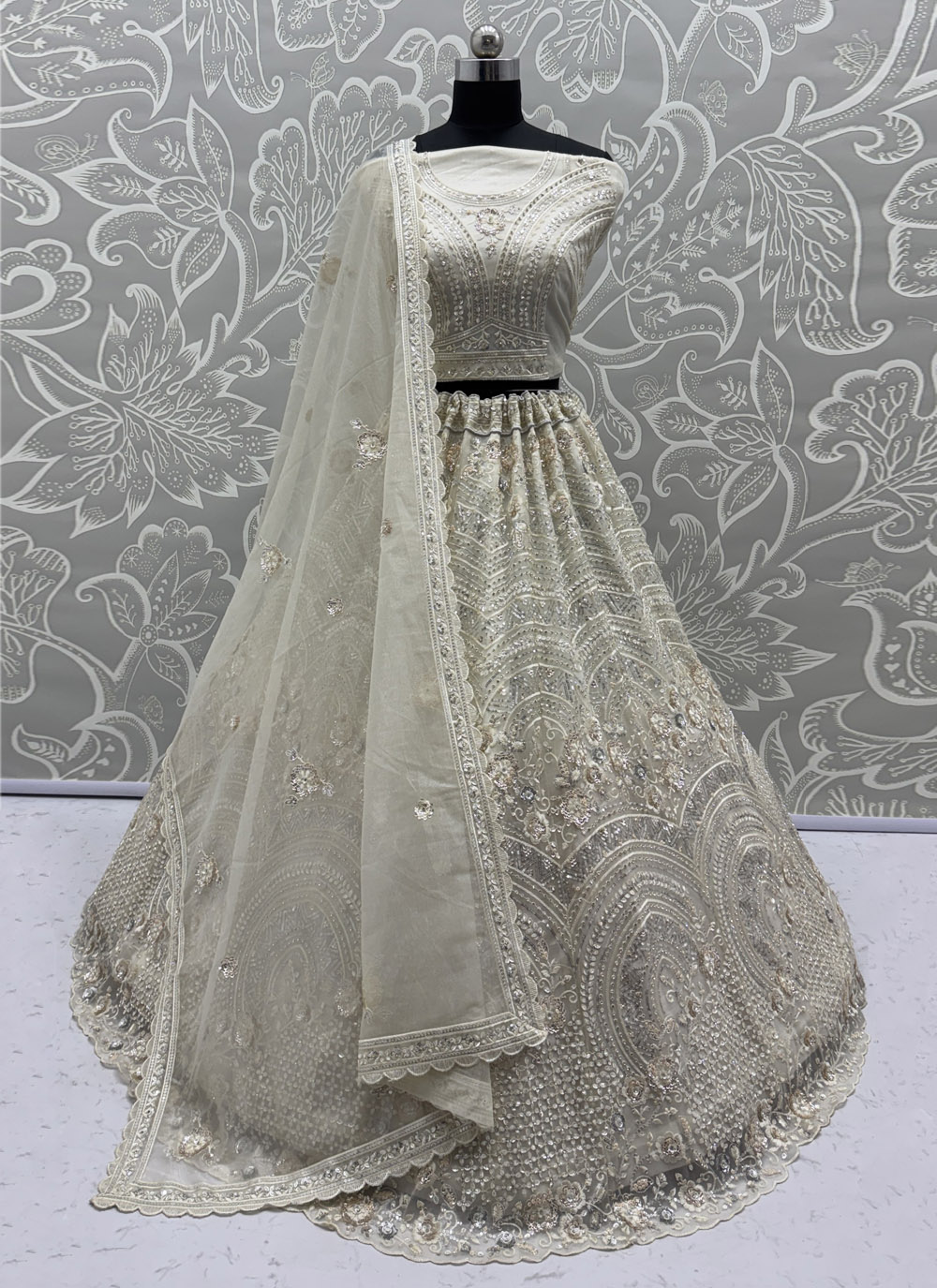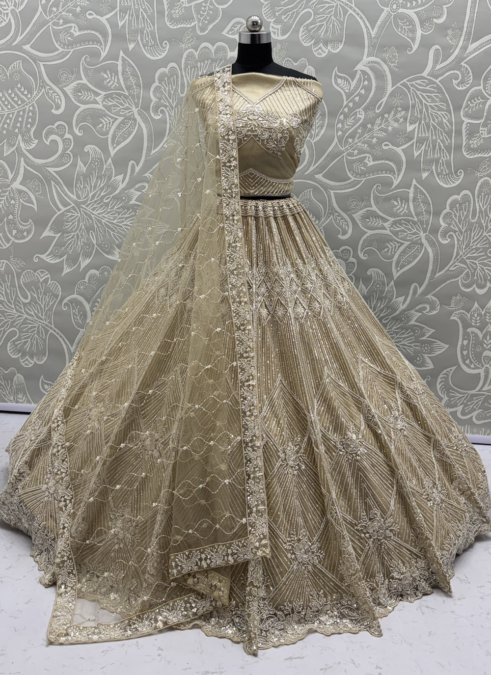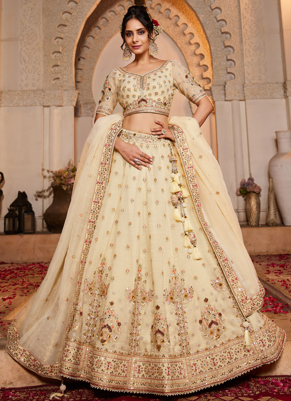 Cream Colour Tissue Sequins Beads Embroidered Lehenga Choli