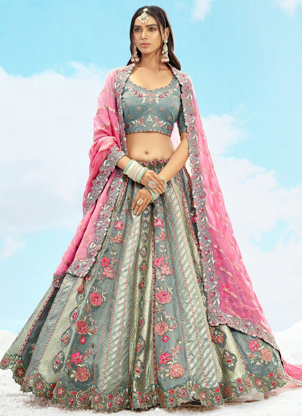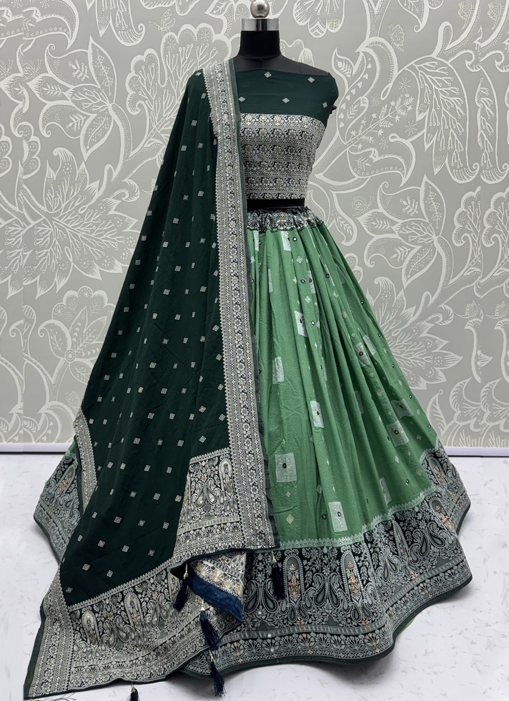 Green Georgette Jacquard and Fancy Work Designer Lehenga Choli