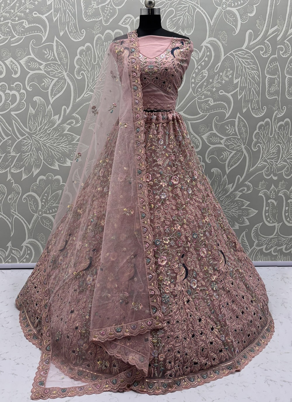Peach Net Dori and Zarkan Work Lehenga Choli for Reception