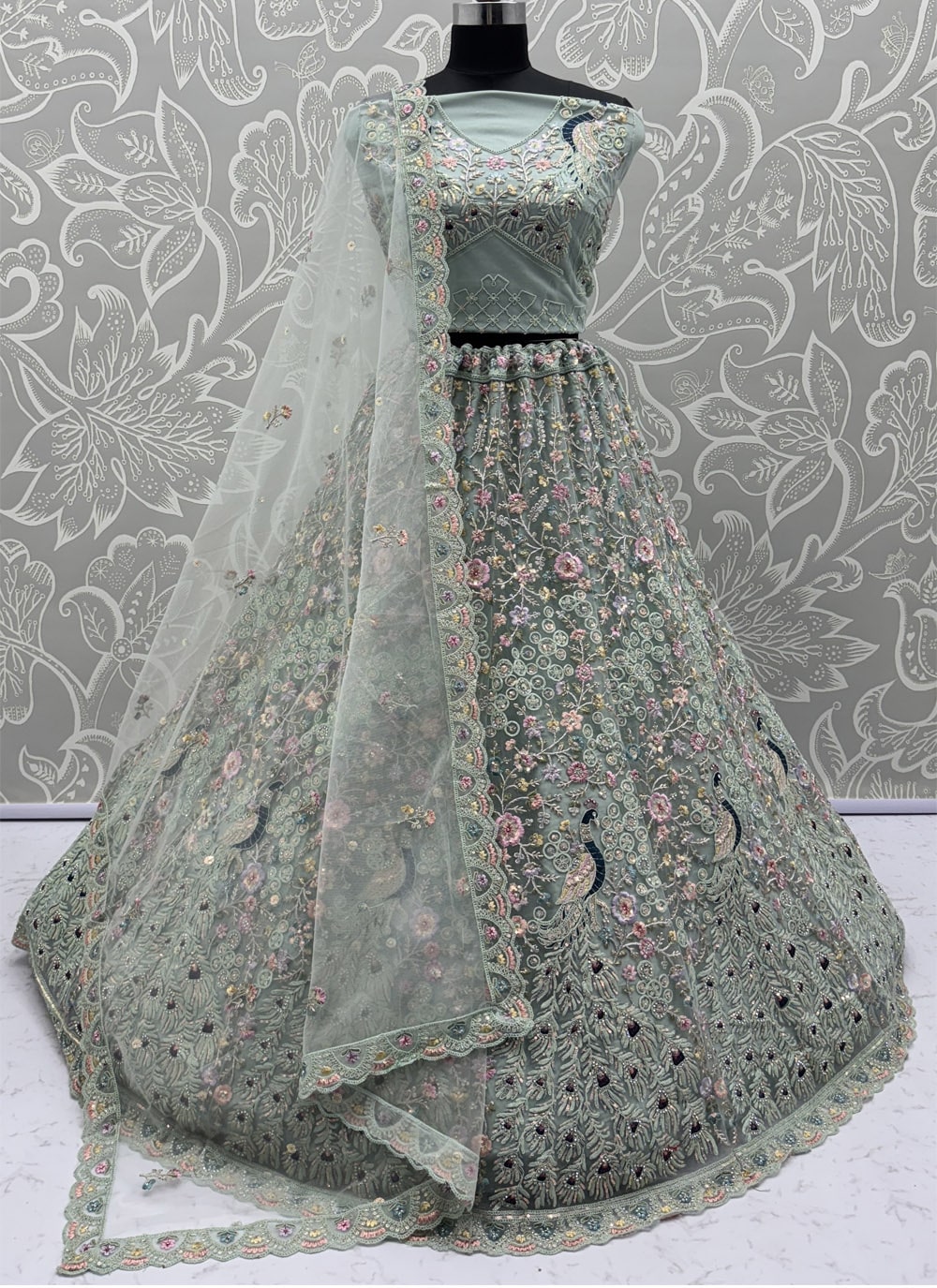 Net Sea Green Dori Zarkan and Diamond Work Lehenga Choli for Sangeet