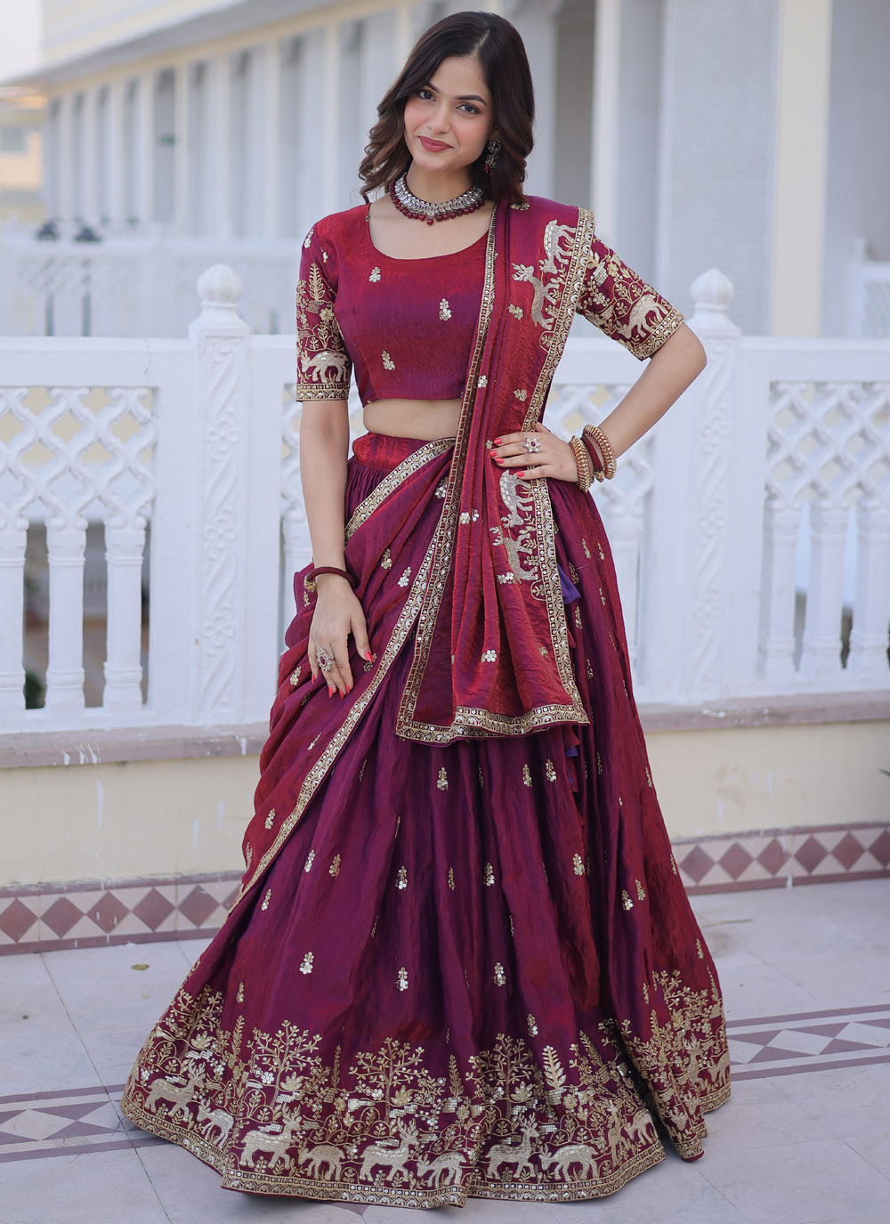 Maroon Fandy Silk Sequins Zari Embroidered Lehenga Choli