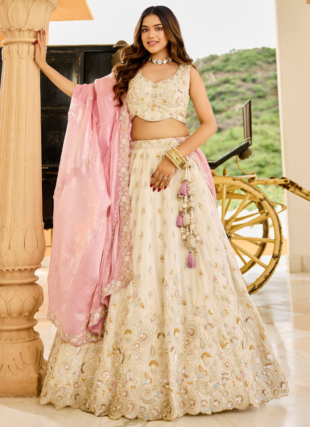 Cream Sequins Stone Thread Embroidered Tissue Lehenga Choli for Sangeet