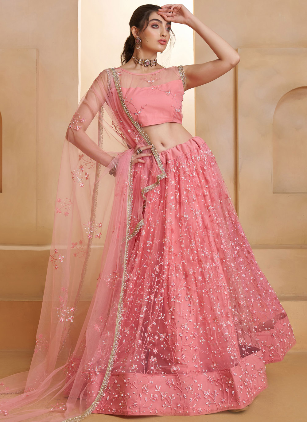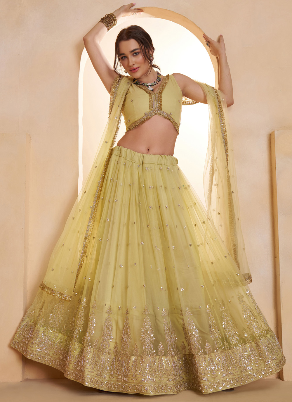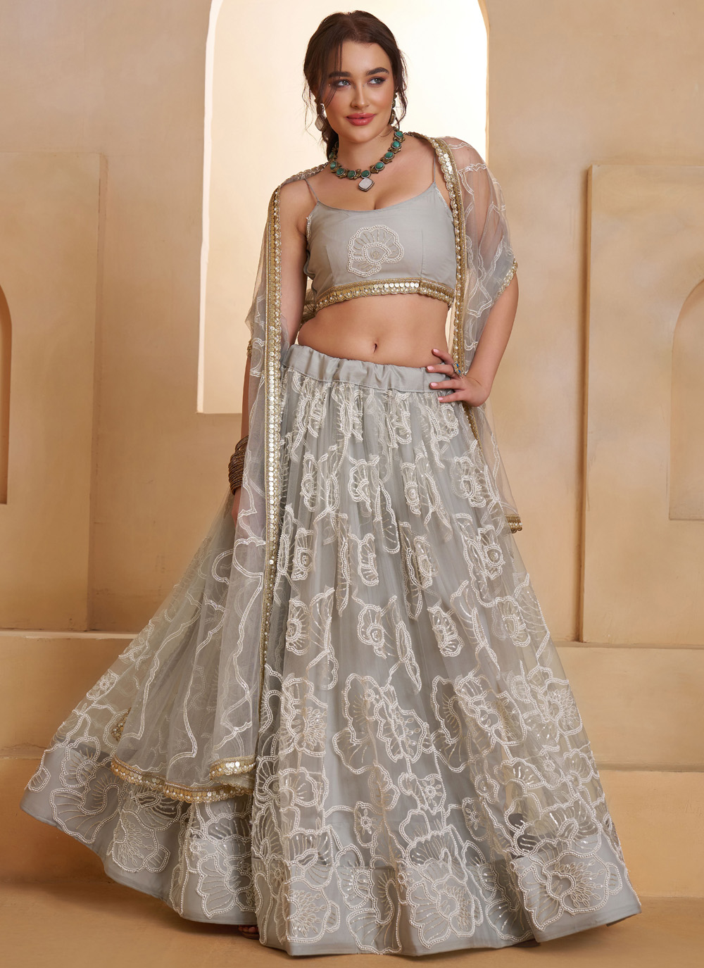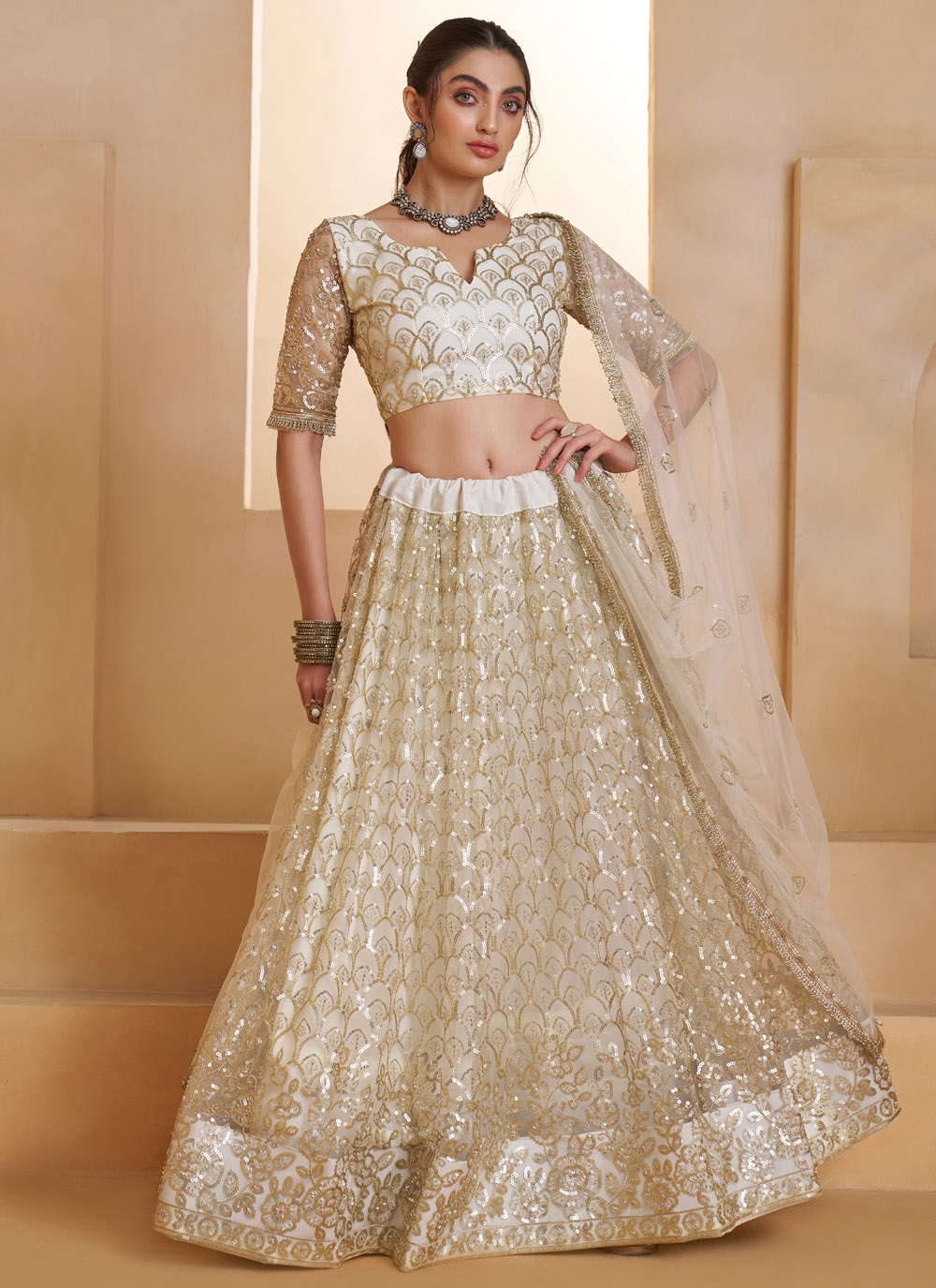 Off White Net Embroidered Thread Sequins Work Lehenga Choli