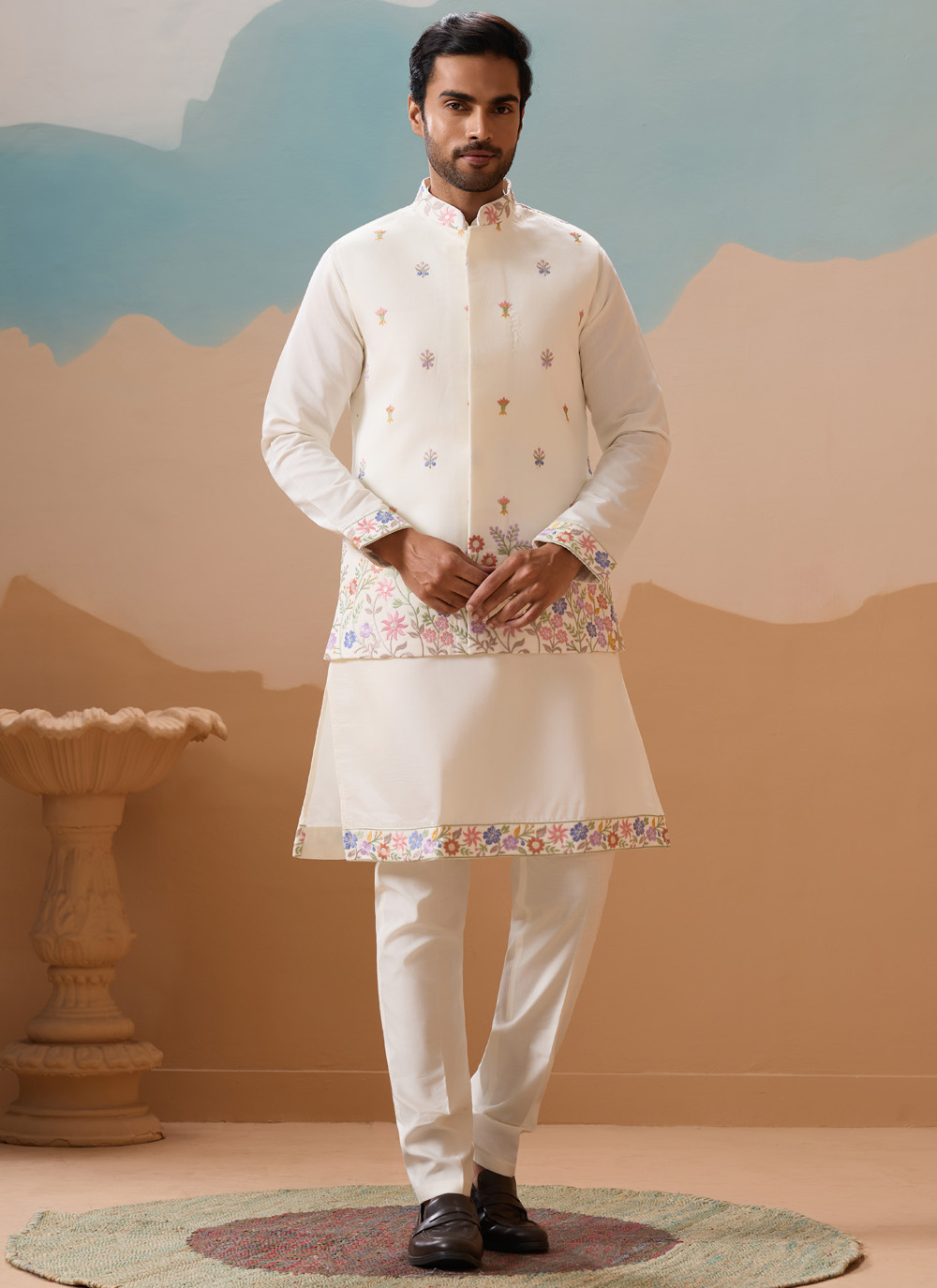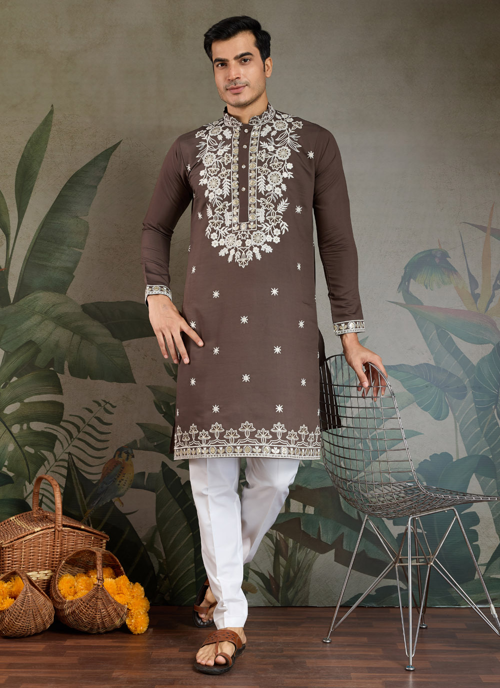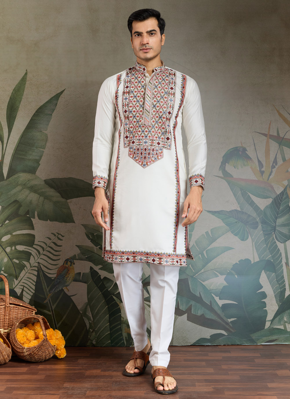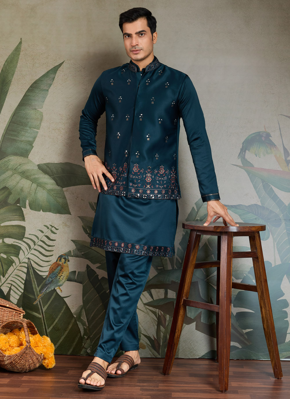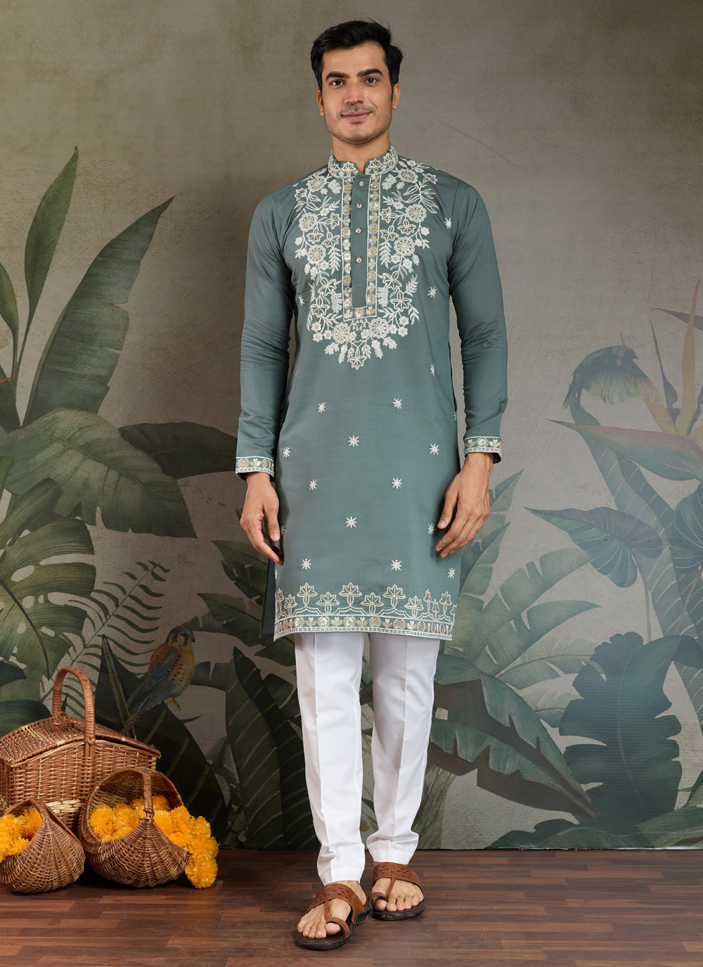 Silk Thread Embroidered Mens Kurta in Sea Green