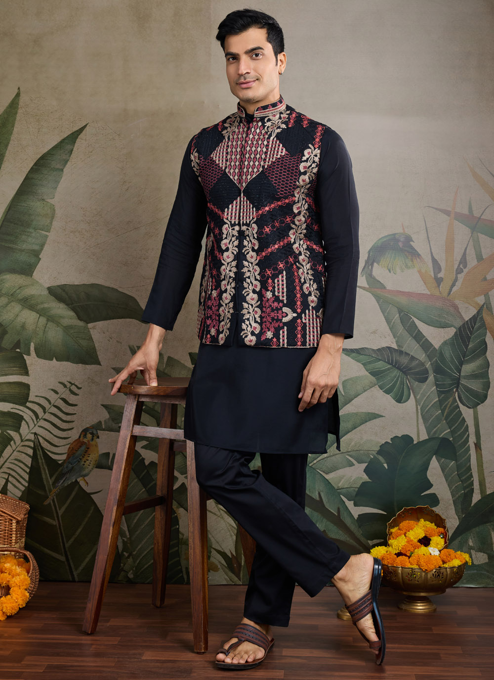 Black Thread Embroidered Viscose Kurta Payjama With Jacket