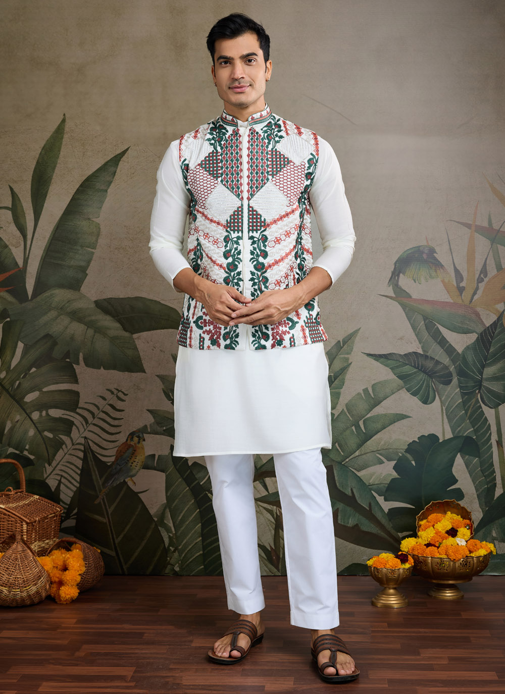 Viscose Embroidered White Kurta Payjama With Jacket