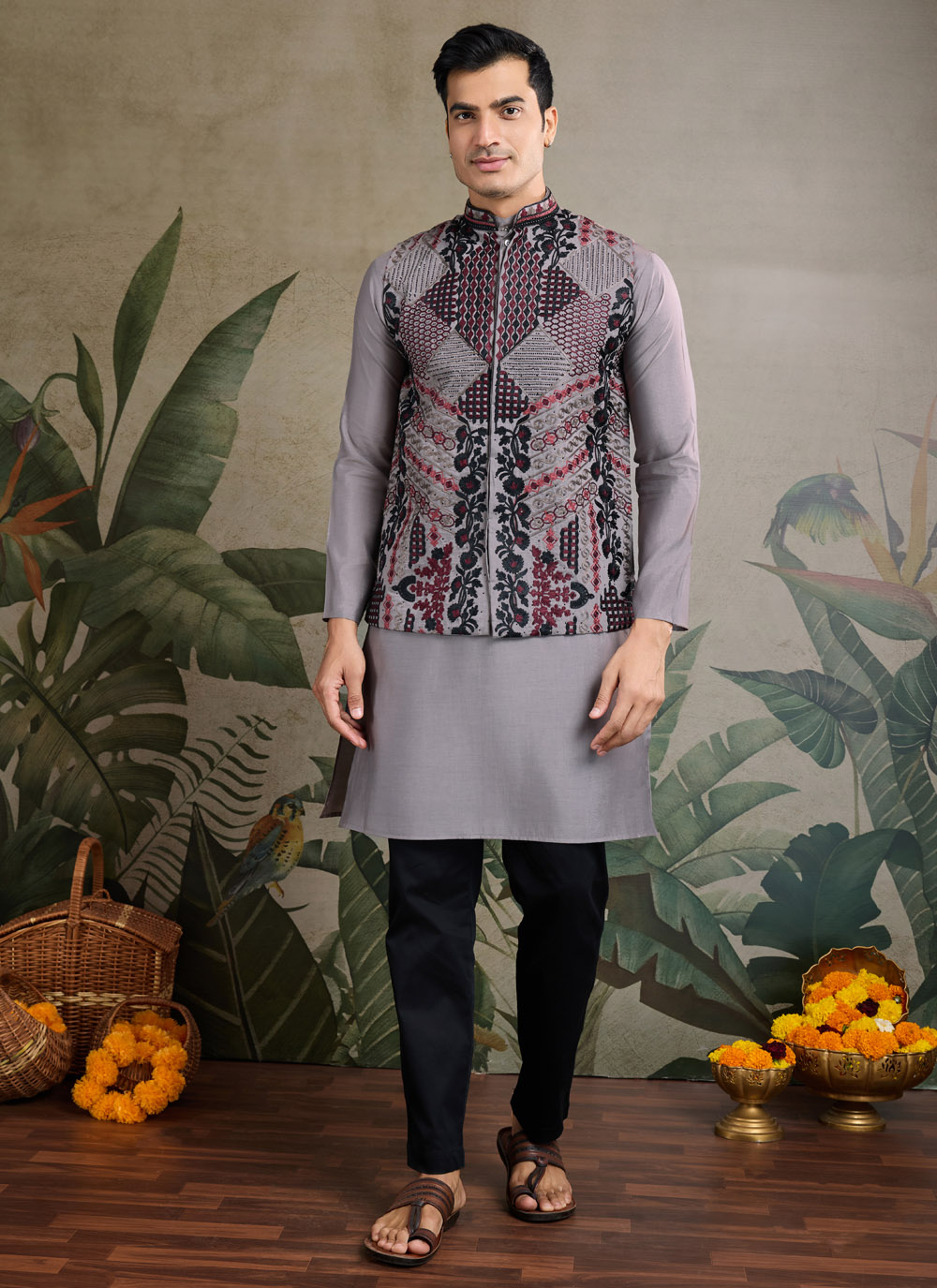 Viscose Grey Embroidered Kurta Payjama With Jacket