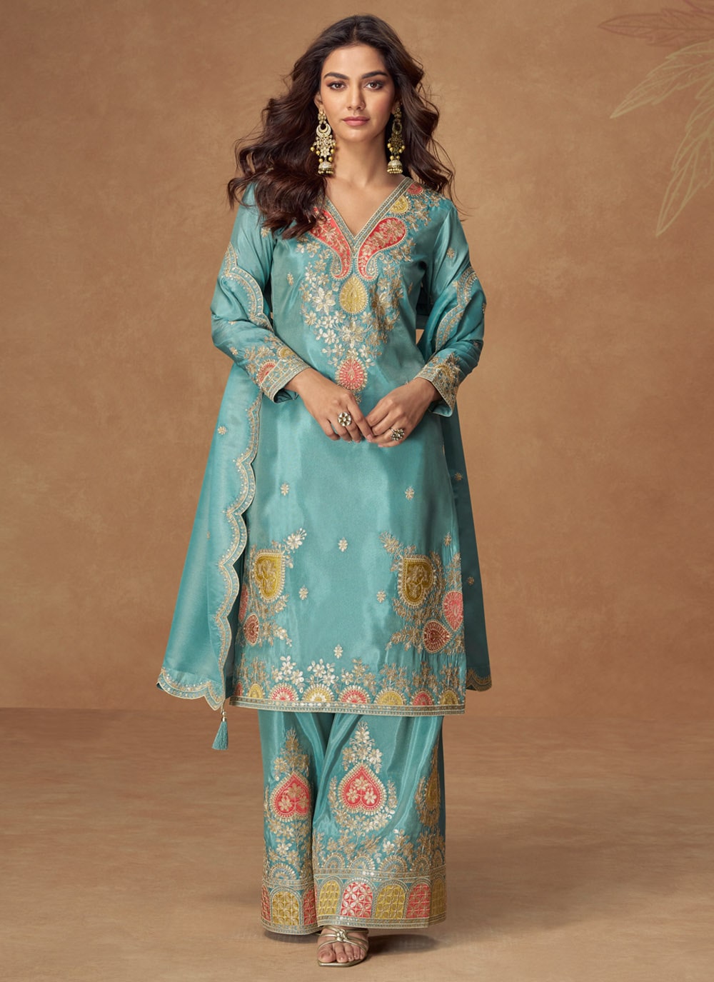 Orange Chinon Silk Embroidered Palazzo Style Salwar Suit