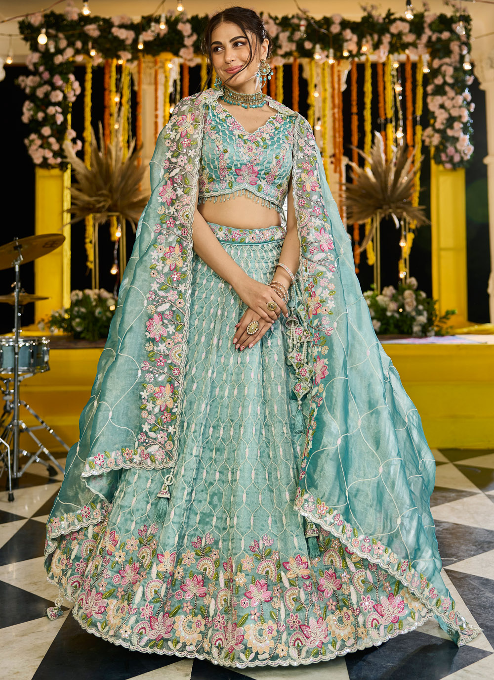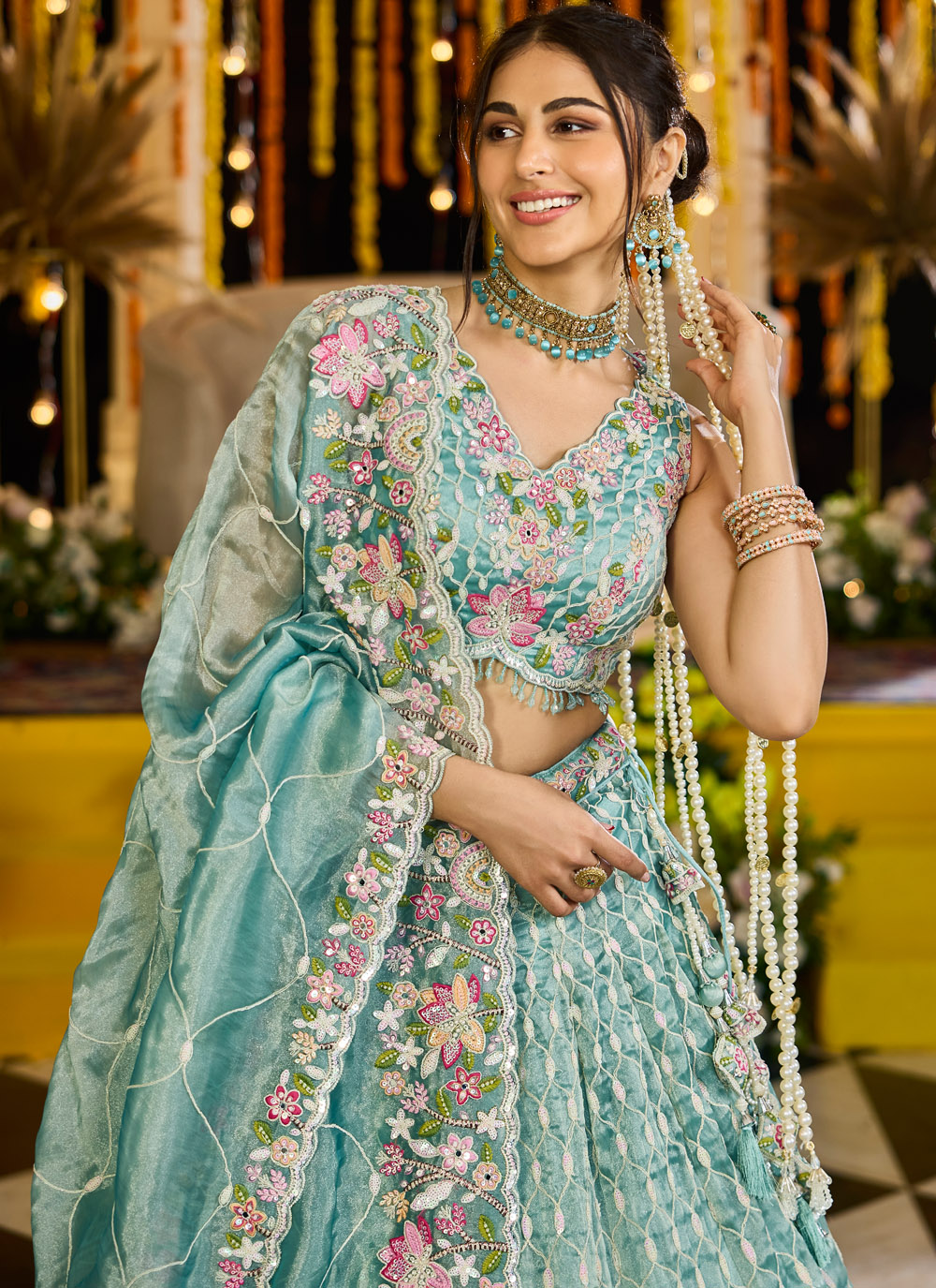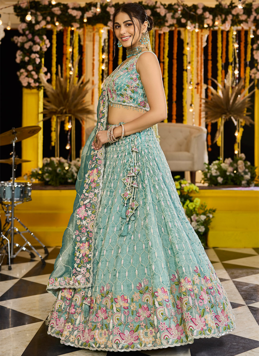 This Aqua Blue Satin Silk Readymade Lehenga Choli is crafted with exquisite sequins, zari, thread, stone, and coding embroidery work, creating a rich festive look. Designed in a trendy style, it is perfect for weddings, receptions and engagement ceremonies. Comes with matching choli and dupatta.