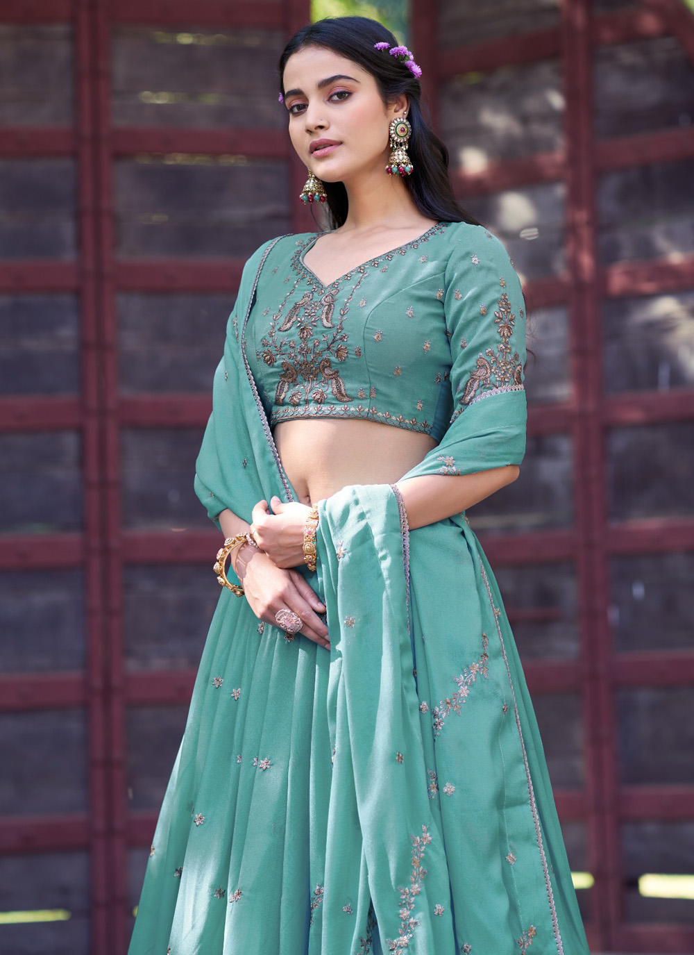 Add a fresh and vibrant touch to your ethnic collection with this aqua blue lehenga choli. Featuring detailed sequins embellishments along with elegant resham and zari embroidery. Comes with matching choli and dupatta.