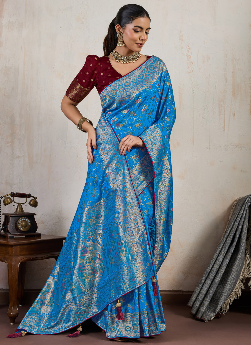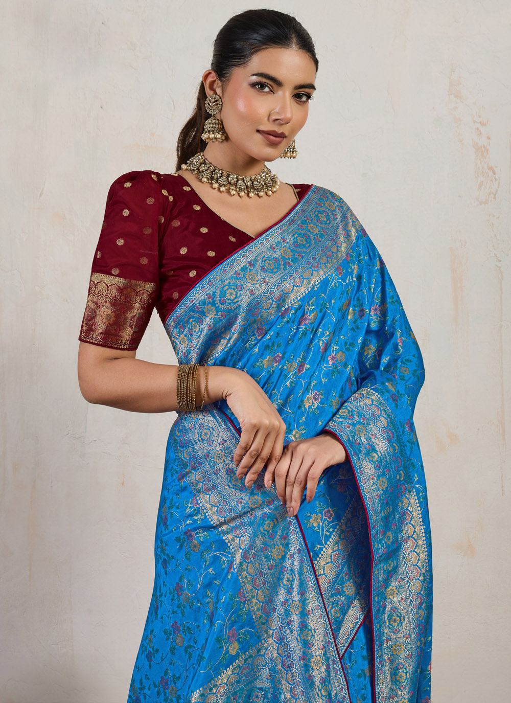 This aqua blue silk saree is a festival-ready masterpiece adorned with meenakari zari thread weaving. Its soothing shade paired with intricate patterns makes it a modern yet traditional outfit for joyous celebrations. Comes with matching blouse.