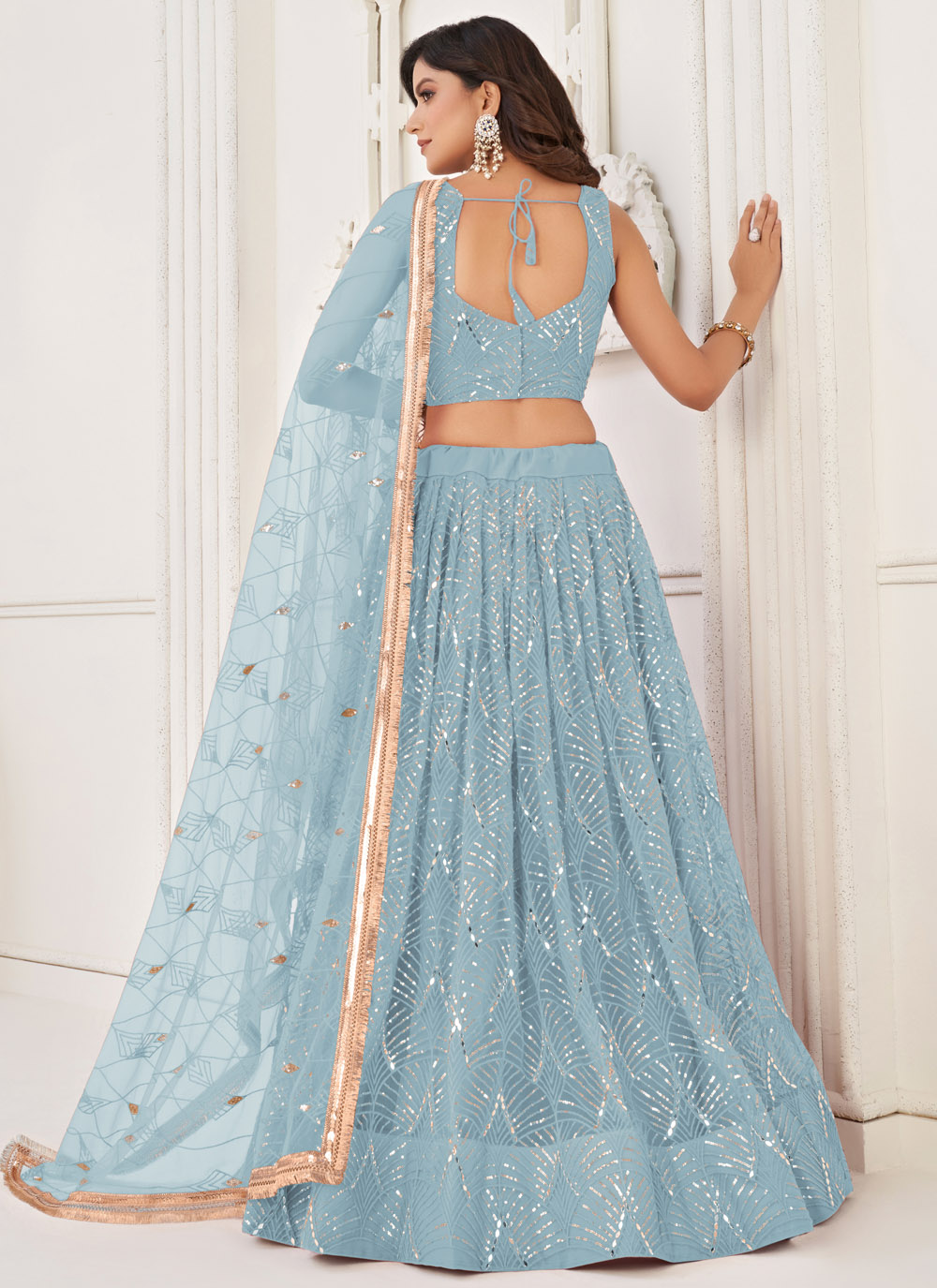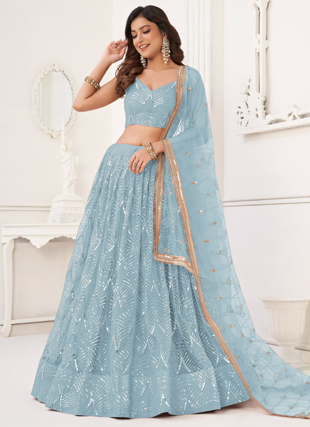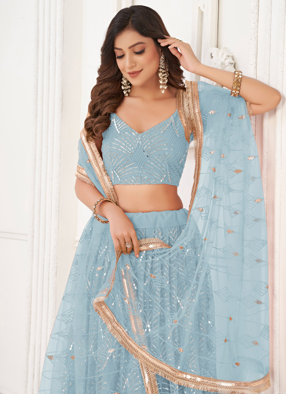This aqua blue lehenga choli is designed to add a modern sparkle to your ethnic look. Made with soft net fabric, it features beautiful sequins and thread embroidery that creates a stylish festive appeal. Perfect for weddings, parties, and special celebrations. Comes with matching choli and dupatta.