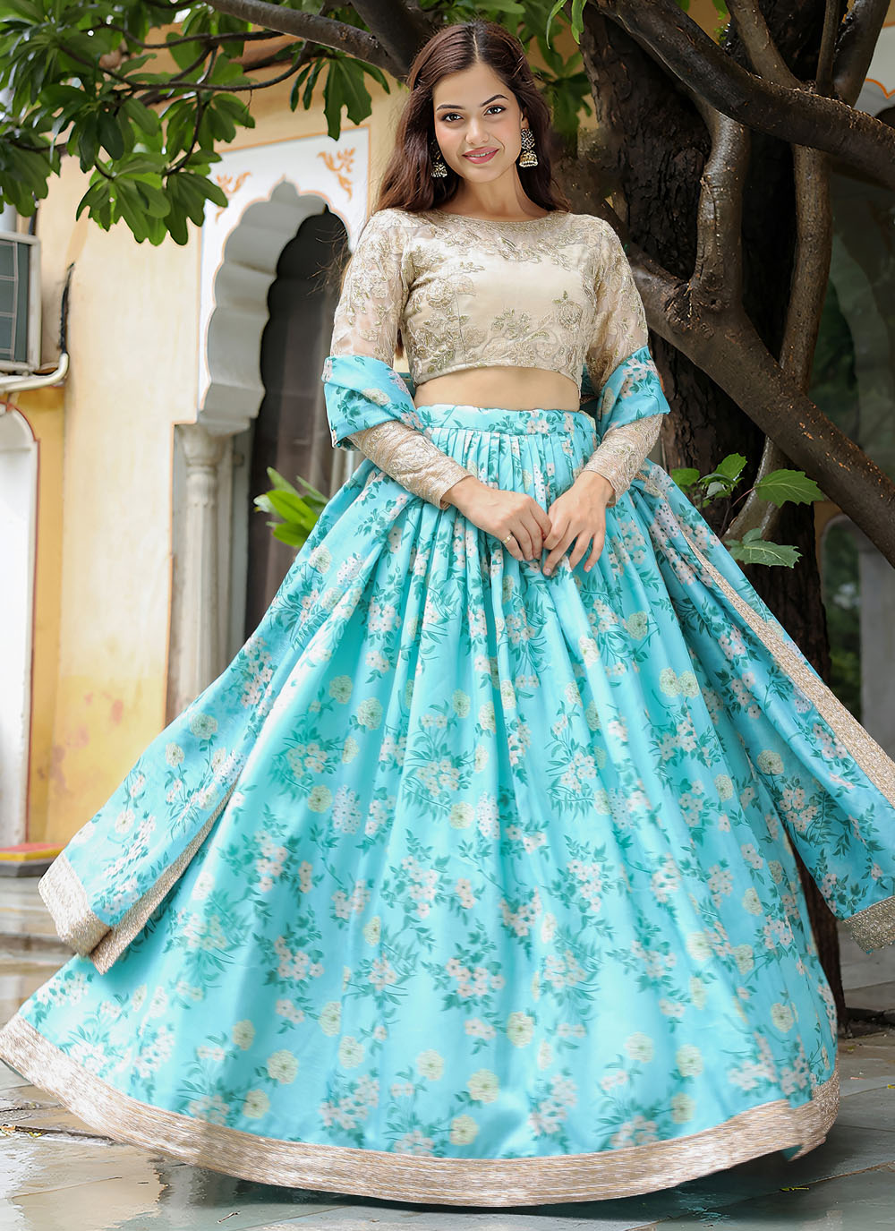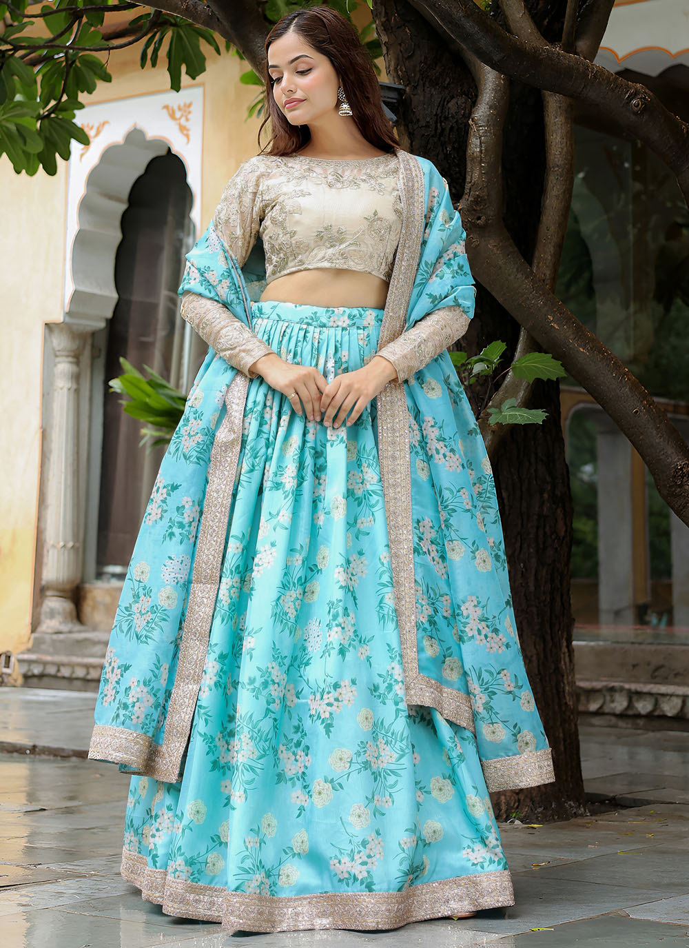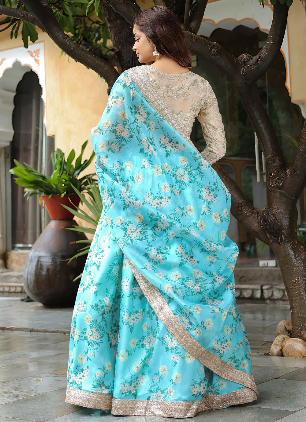 Refresh your festive wardrobe with this Aqua Blue Organza Lehenga Choli, featuring delicate floral prints and elegant lace work. The lightweight organza fabric drapes beautifully, offering an airy and graceful flow. Perfect for celebrations or festive gatherings. Comes with matching choli and dupatta.