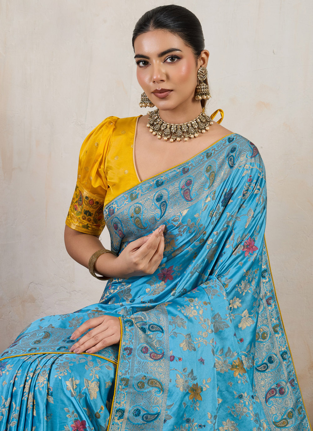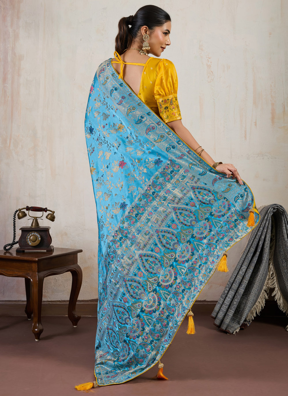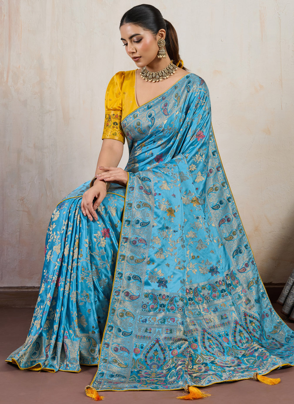 This aqua blue satin designer saree features beautiful meenakari woven work that adds a rich artistic touch. The smooth satin fabric offers a glossy finish and graceful drape, making it a perfect choice for festive occasions and celebrations. Comes with matching blouse.