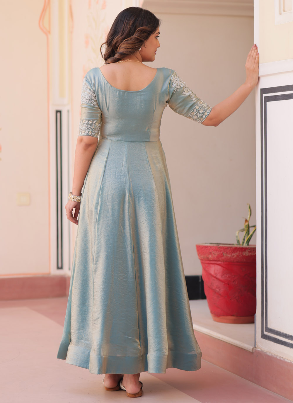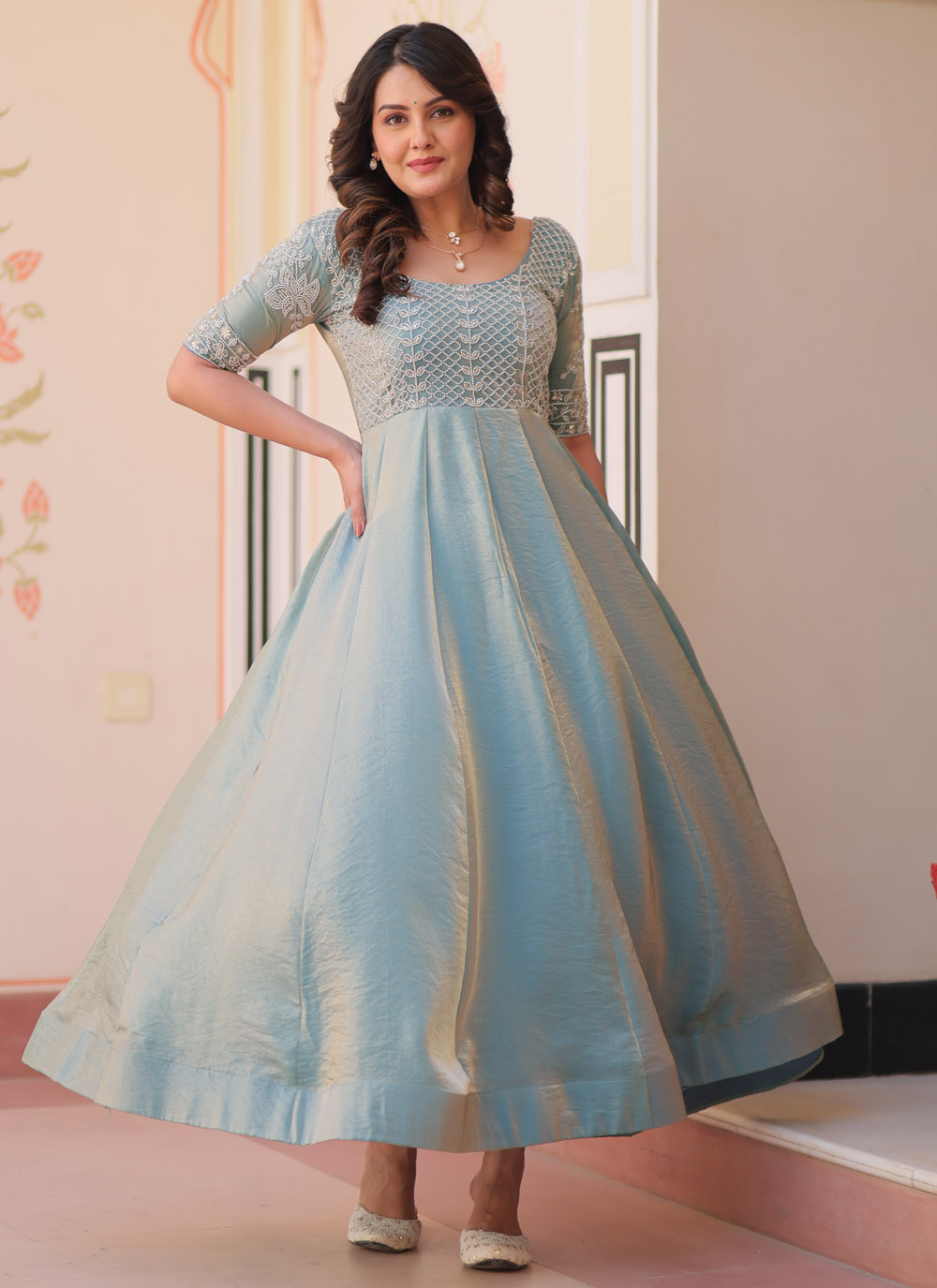 Let your style speak elegance with this Aqua Blue Silk Embroidered Gown. The gown blends contemporary silhouette with intricate embroidery, making it a showstopper for weddings, receptions or festivals.