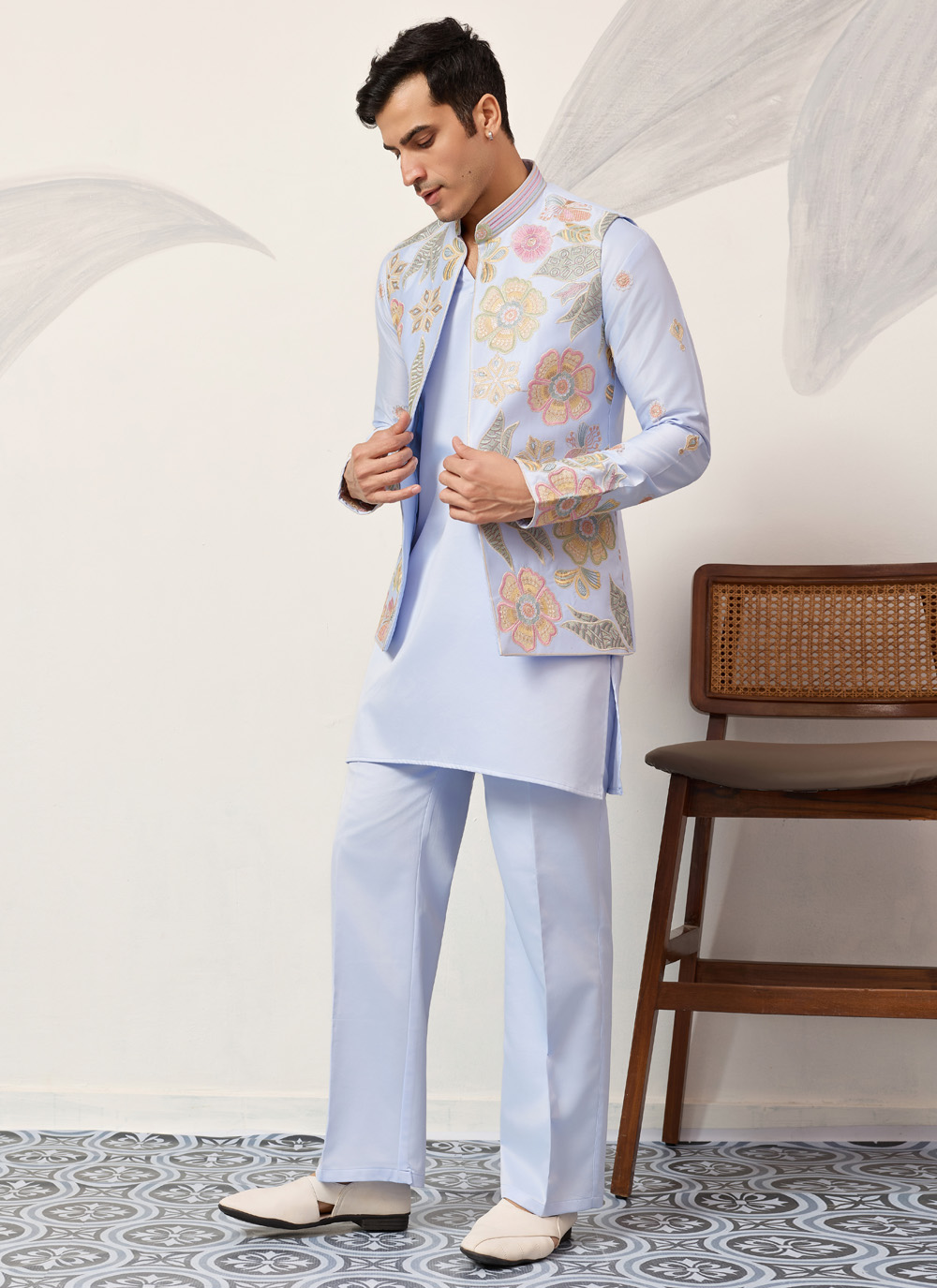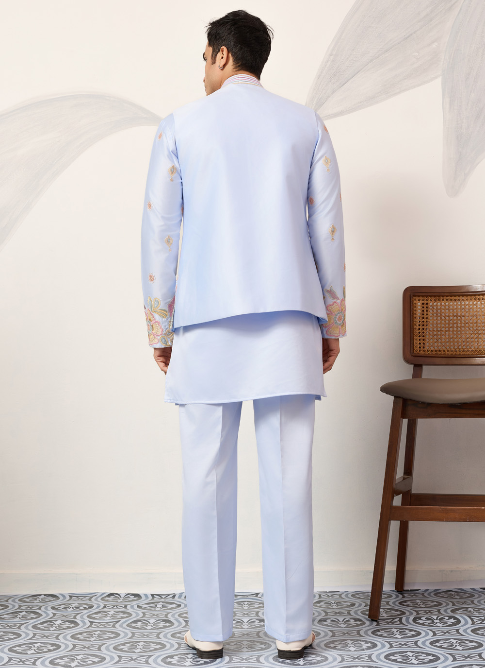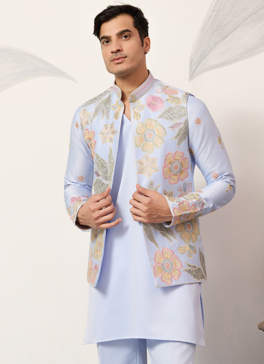 This Aqua Blue Satin Silk Kurta Payjama Set with Jacket is designed for men who value elegance and comfort. The intricate thread and sequins embroidery adds a designer touch, while the smooth fabric ensures a graceful drape.