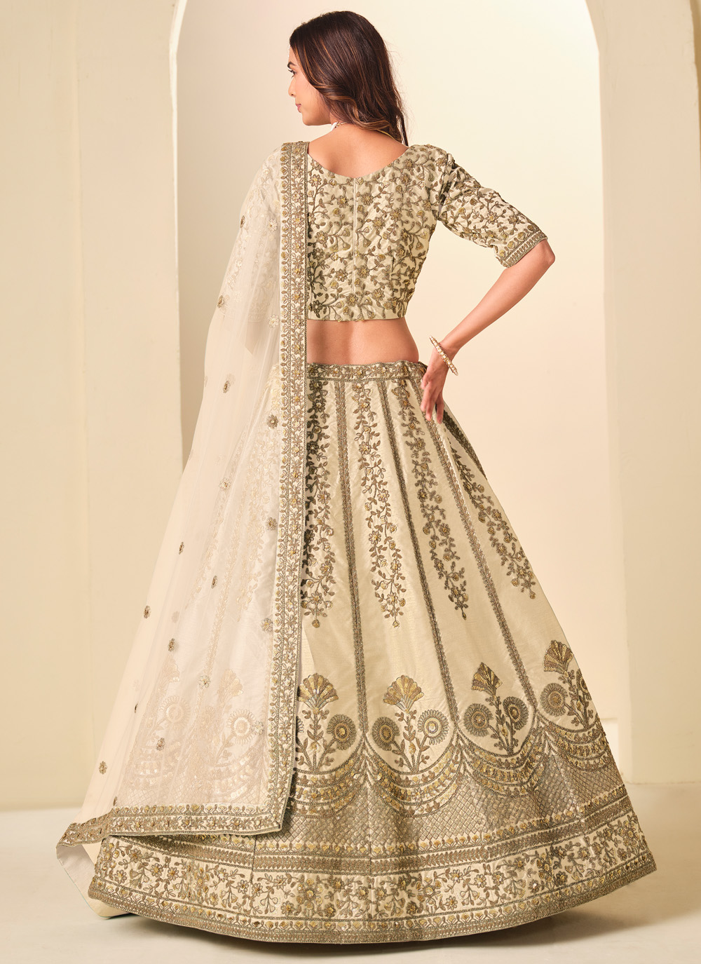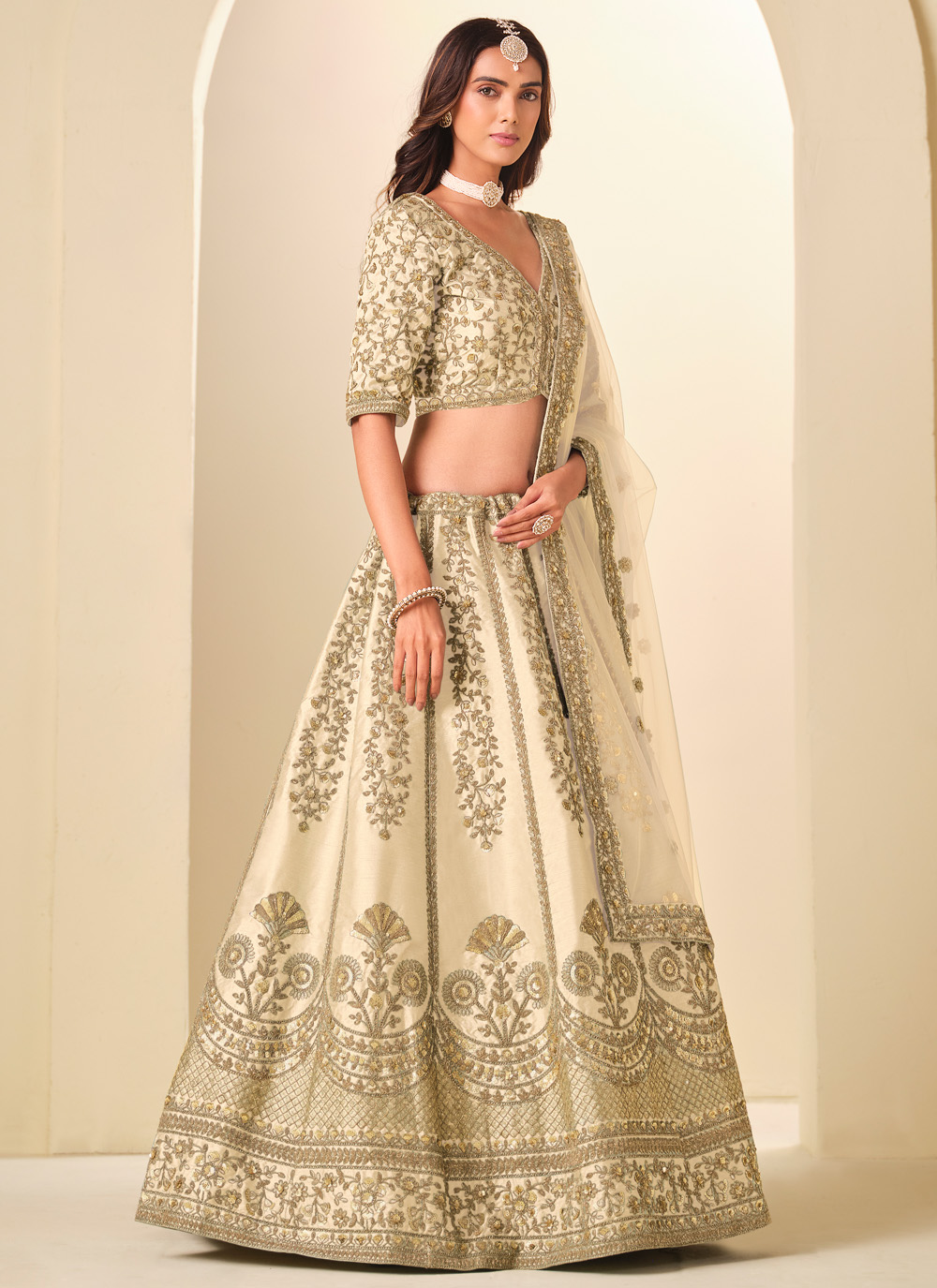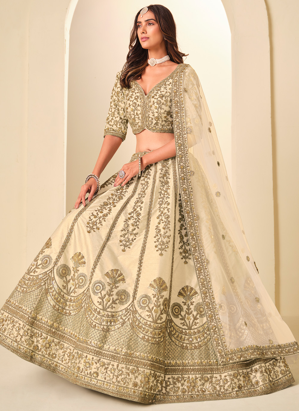 Elevate your festive style with this Art Silk Cream Embroidered Sequins Resham Work Lehenga Choli. Crafted from rich art silk fabric, the lehenga features intricate resham embroidery highlighted with delicate sequins that add a soft shimmer. Comes with matching choli and dupatta.