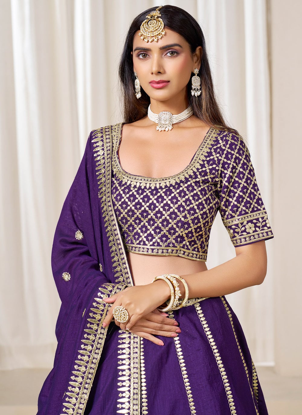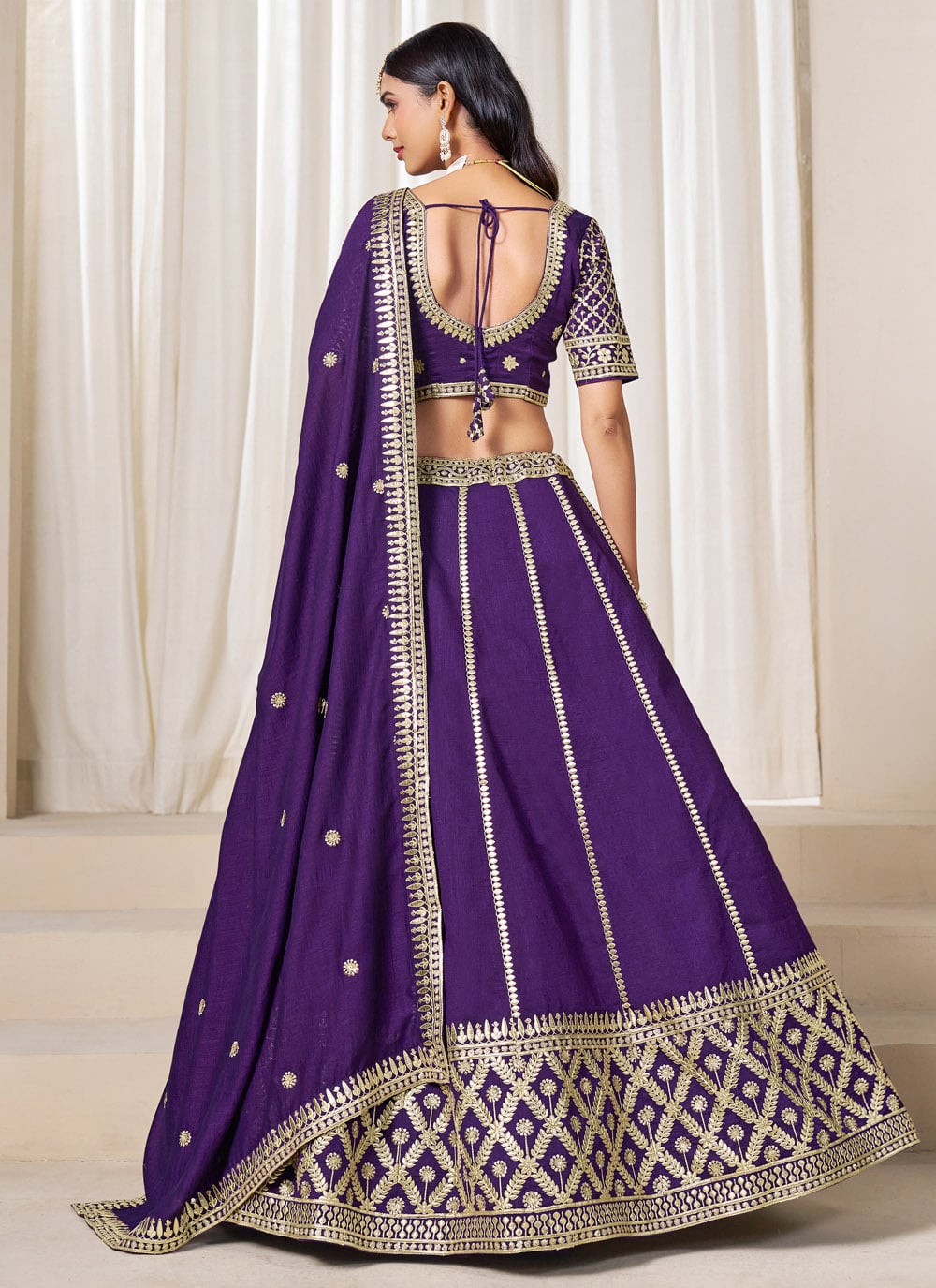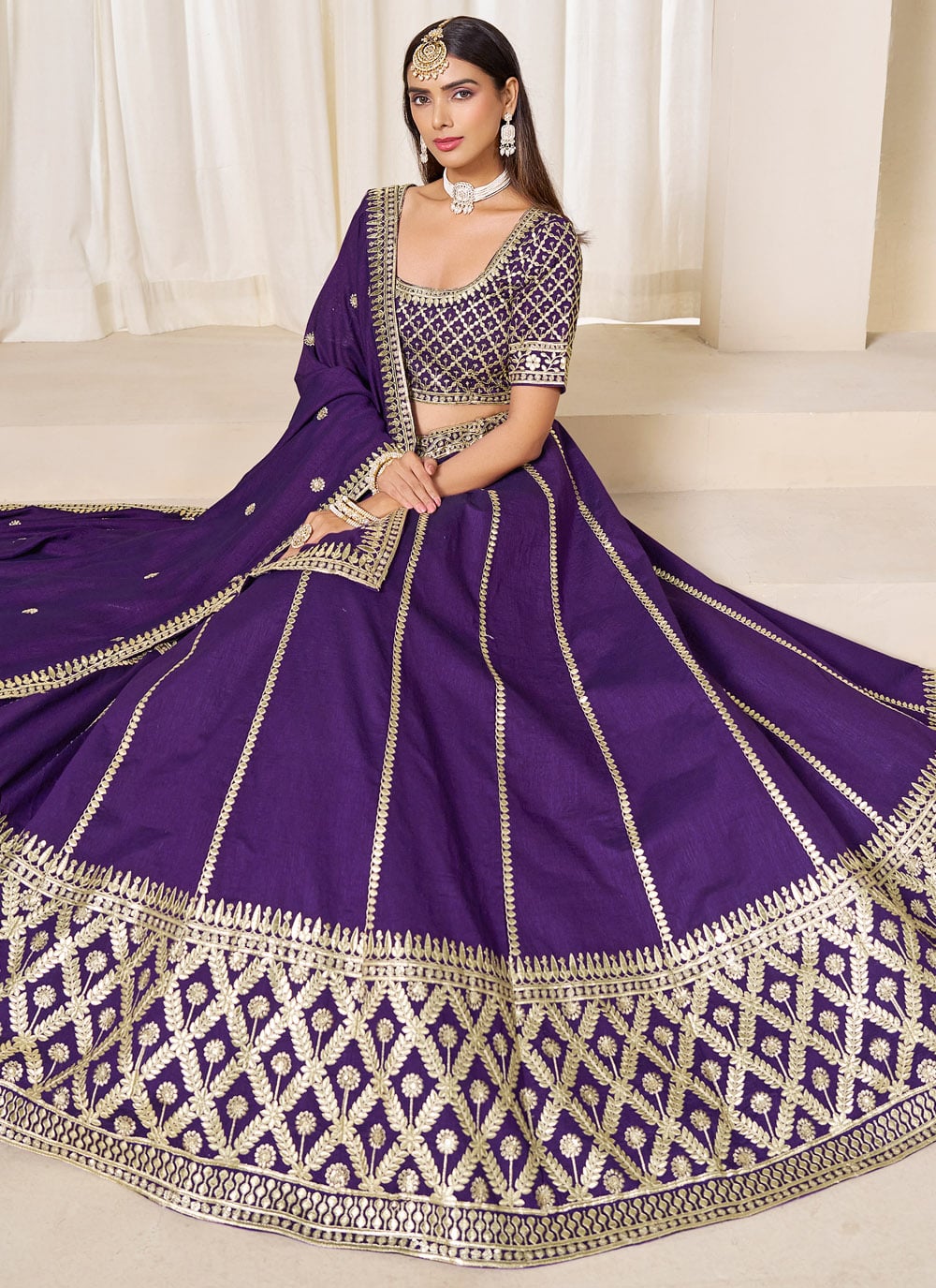 Step into style with this Designer Purple Art Silk Lehenga Choli, featuring delicate sequins and zari work on a flowing A-line cut. Ideal for traditional ceremonies and festive occasions, it combines sophistication with modern flair. Comes with matching choli and dupatta.