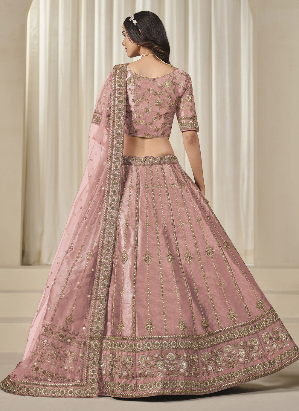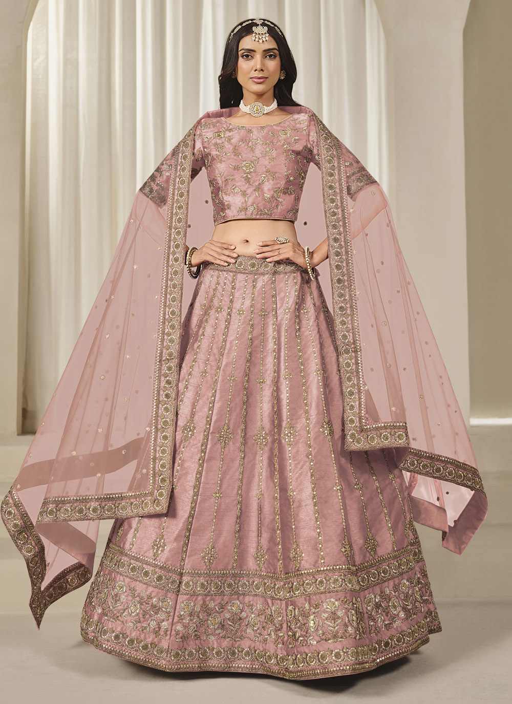 Crafted in smooth art silk, this pink lehenga choli showcases a stunning combination of sequin and zari embroidery that catches the light beautifully. Ideal for engagement ceremonies and pre-wedding celebrations, it offers a refined blend of tradition and contemporary style. Comes with matching choli and dupatta.