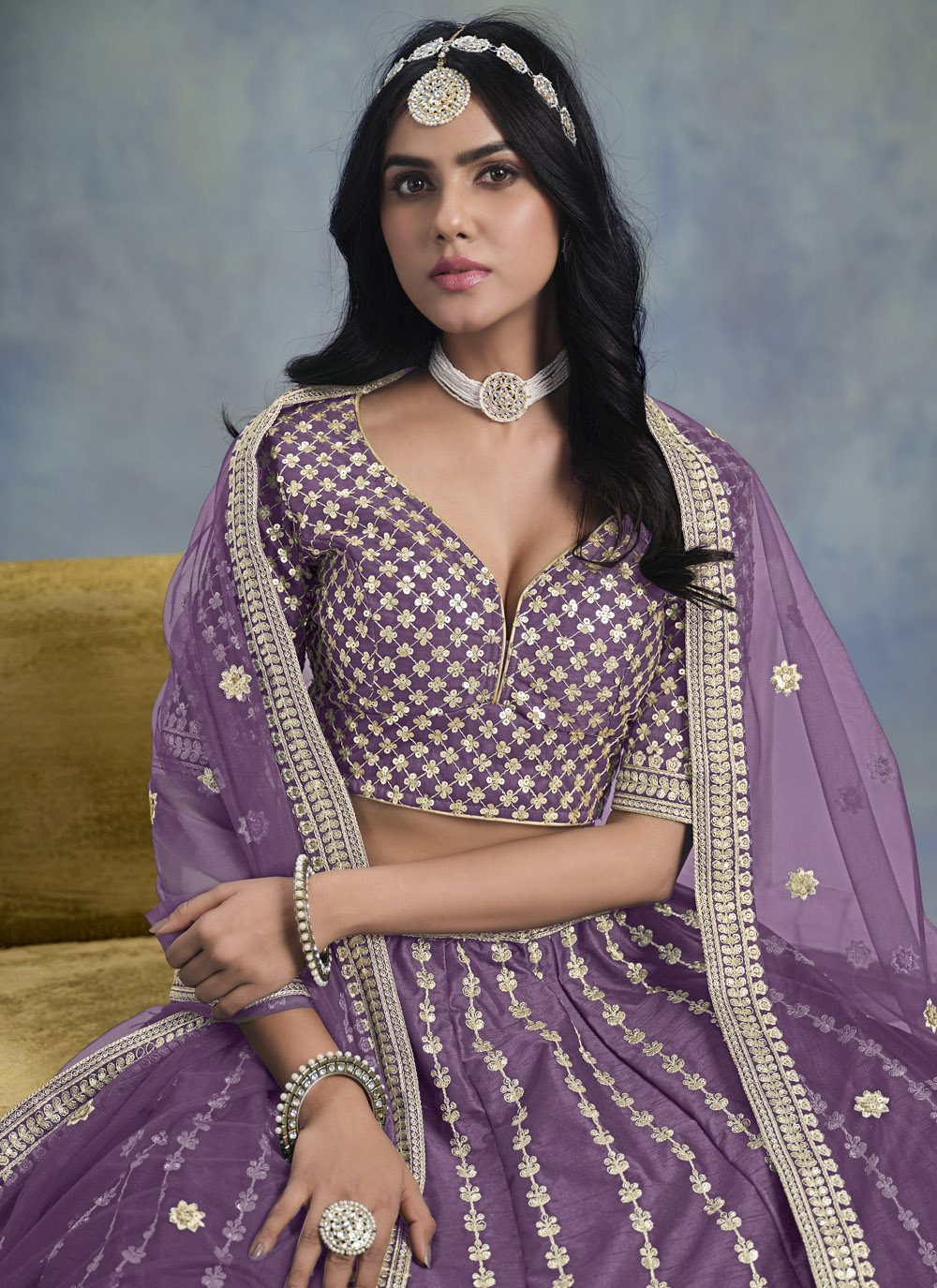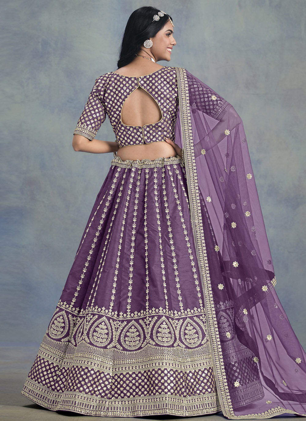 This ceremonial lehenga choli in purple art silk is perfect for women who want a look that’s both classic and captivating. The carefully placed embroidery along the lehenga and choli adds a touch of heritage, while the vibrant color brings a modern vibe to traditional wear. Comes with matching choli and dupatta.
