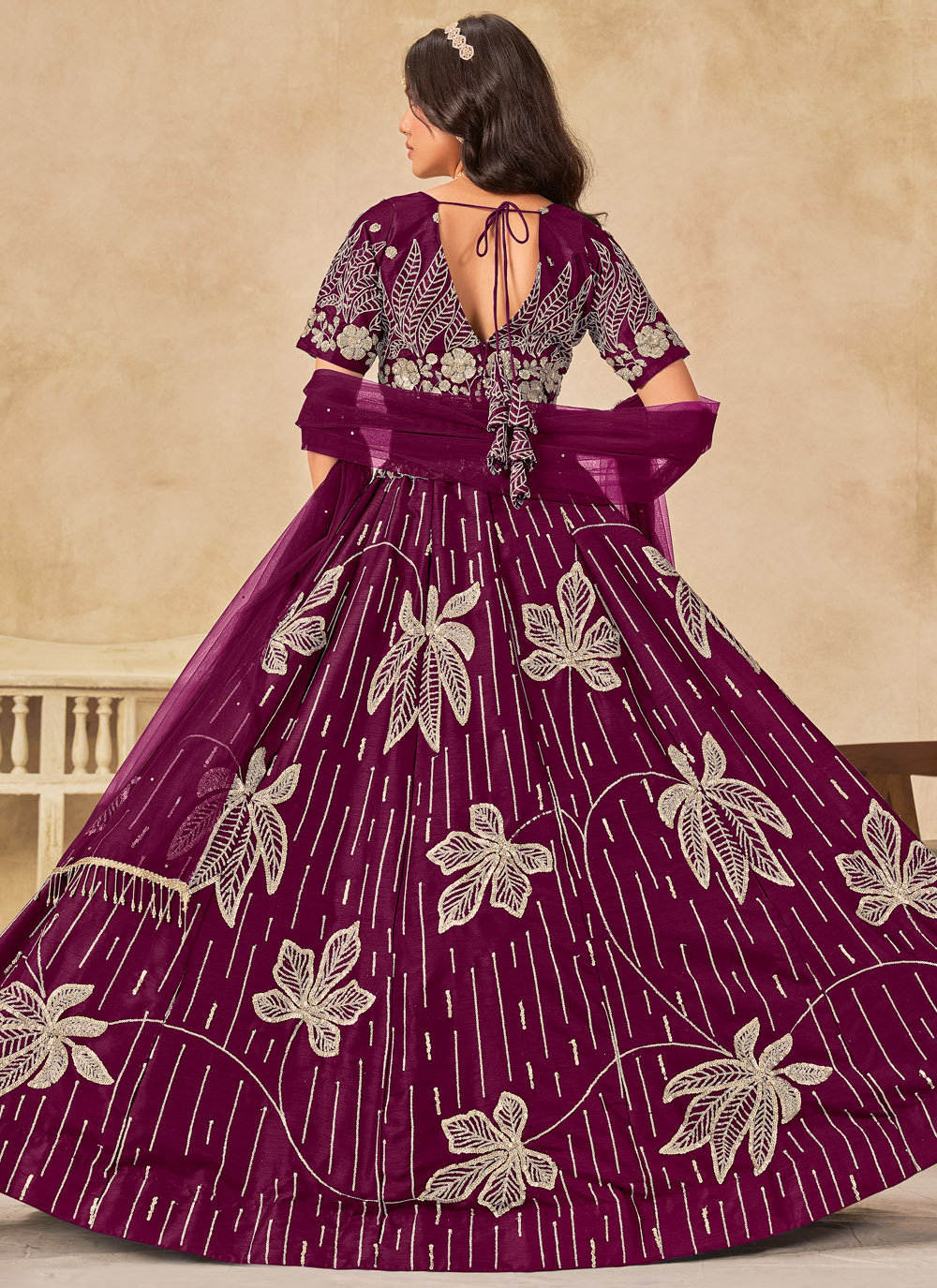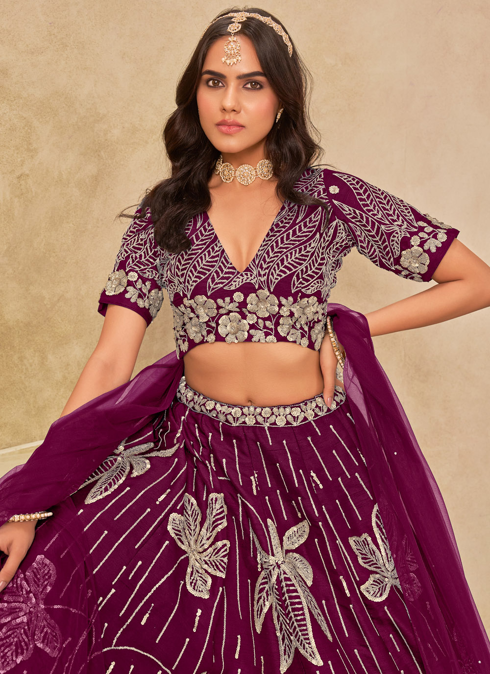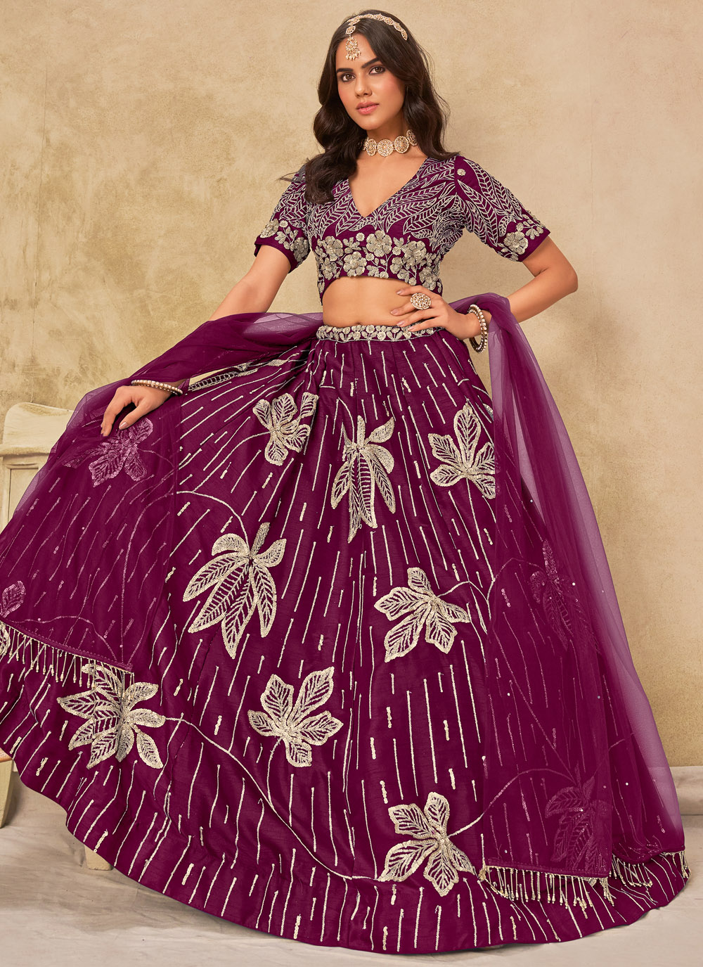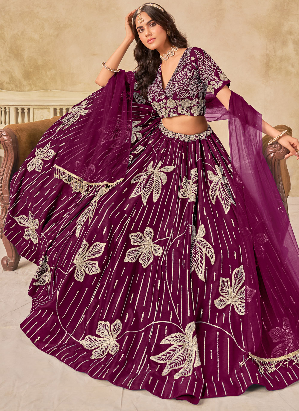 This purple art silk lehenga choli, exquisitely detailed with sequin embroidery that shimmers with every move. Its rich hue and sparkling finish make it an ideal choice for sangeet nights, where glamour meets tradition effortlessly. Comes with matching choli and dupatta.
