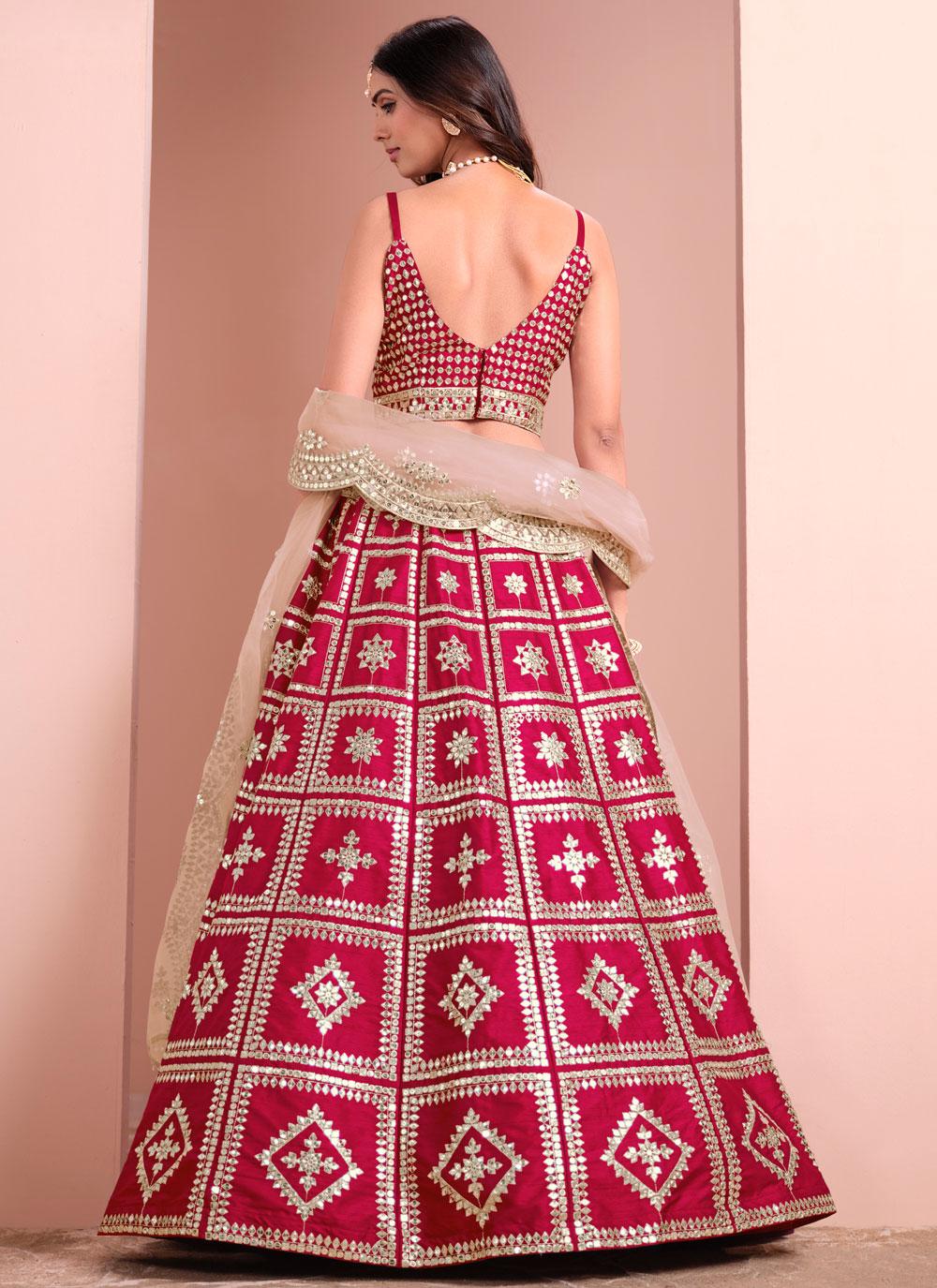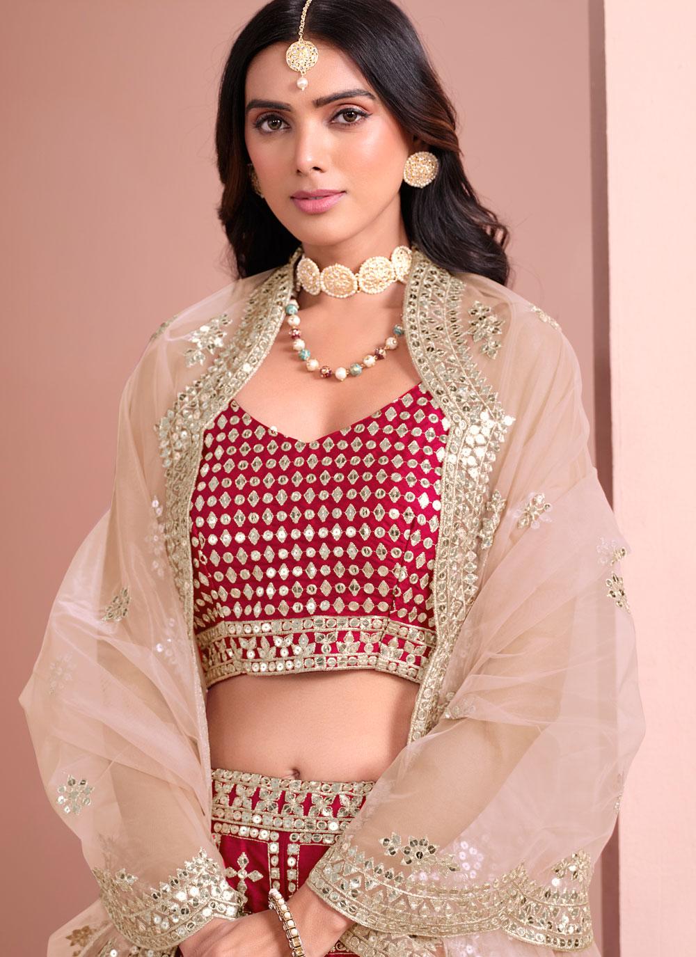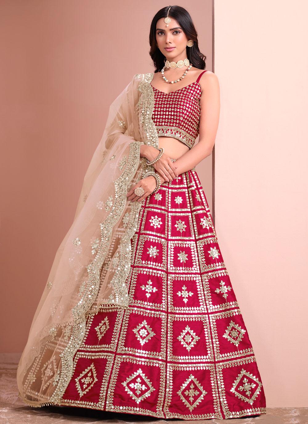 This Art Silk Rani Color Embroidered A-Line Lehenga Choli features exquisite embroidery and a flattering A-line shape. The vibrant rani color adds a bold touch, while the matching dupatta completes the look, making it perfect for weddings or festive occasions.