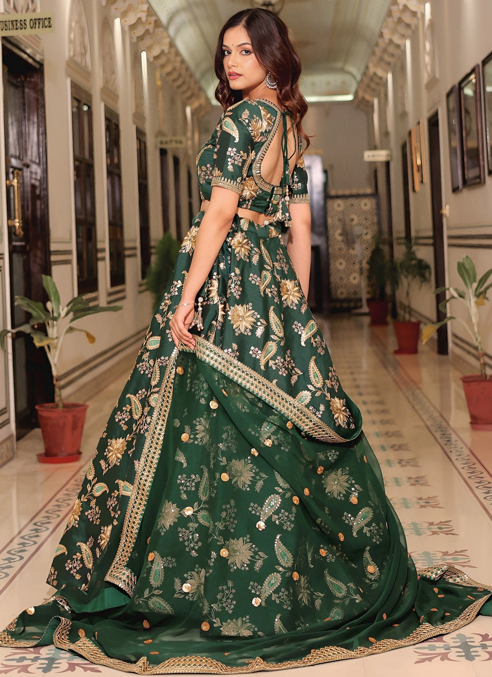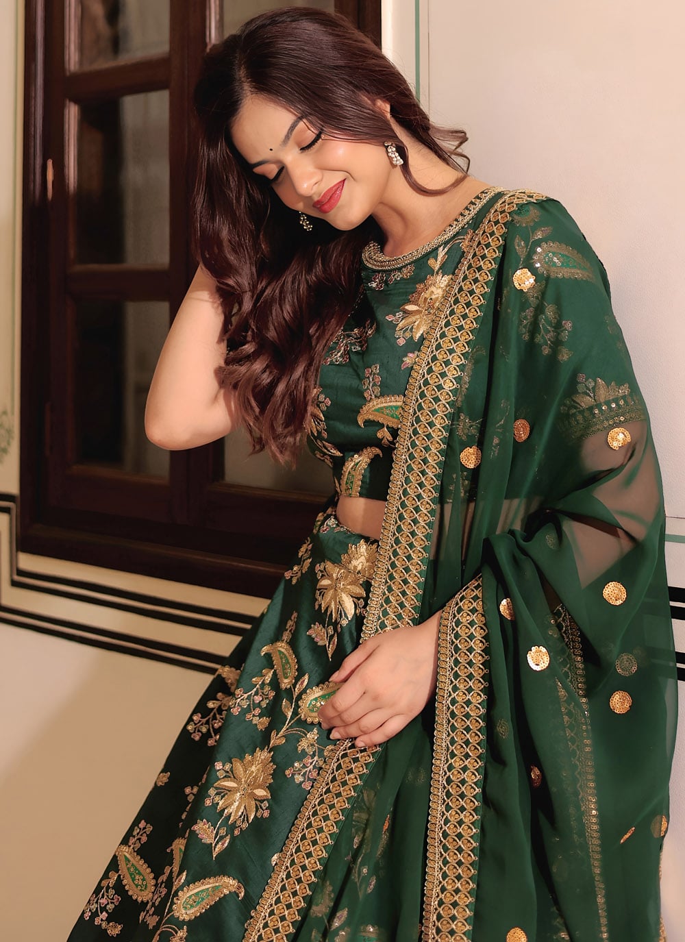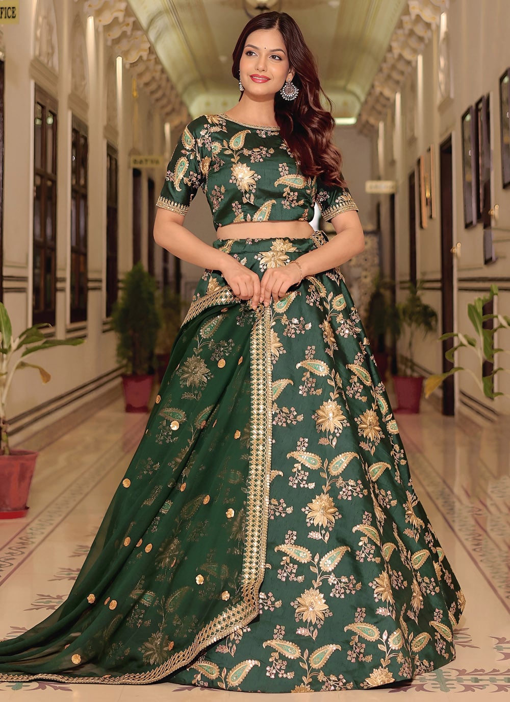 This Designer Green Art Silk Lehenga Choli combines traditional artistry with contemporary style, featuring sequins, thread work and zari dori detailing. Ideal for ceremonies, receptions and festive events, it ensures a regal appearance. Comes with matching choli and dupatta.