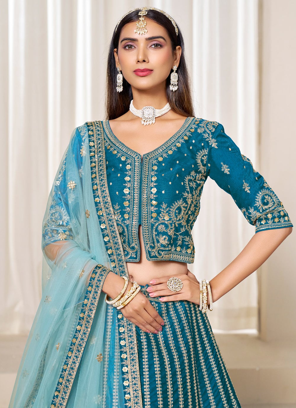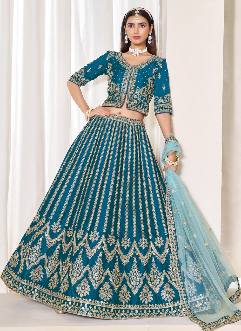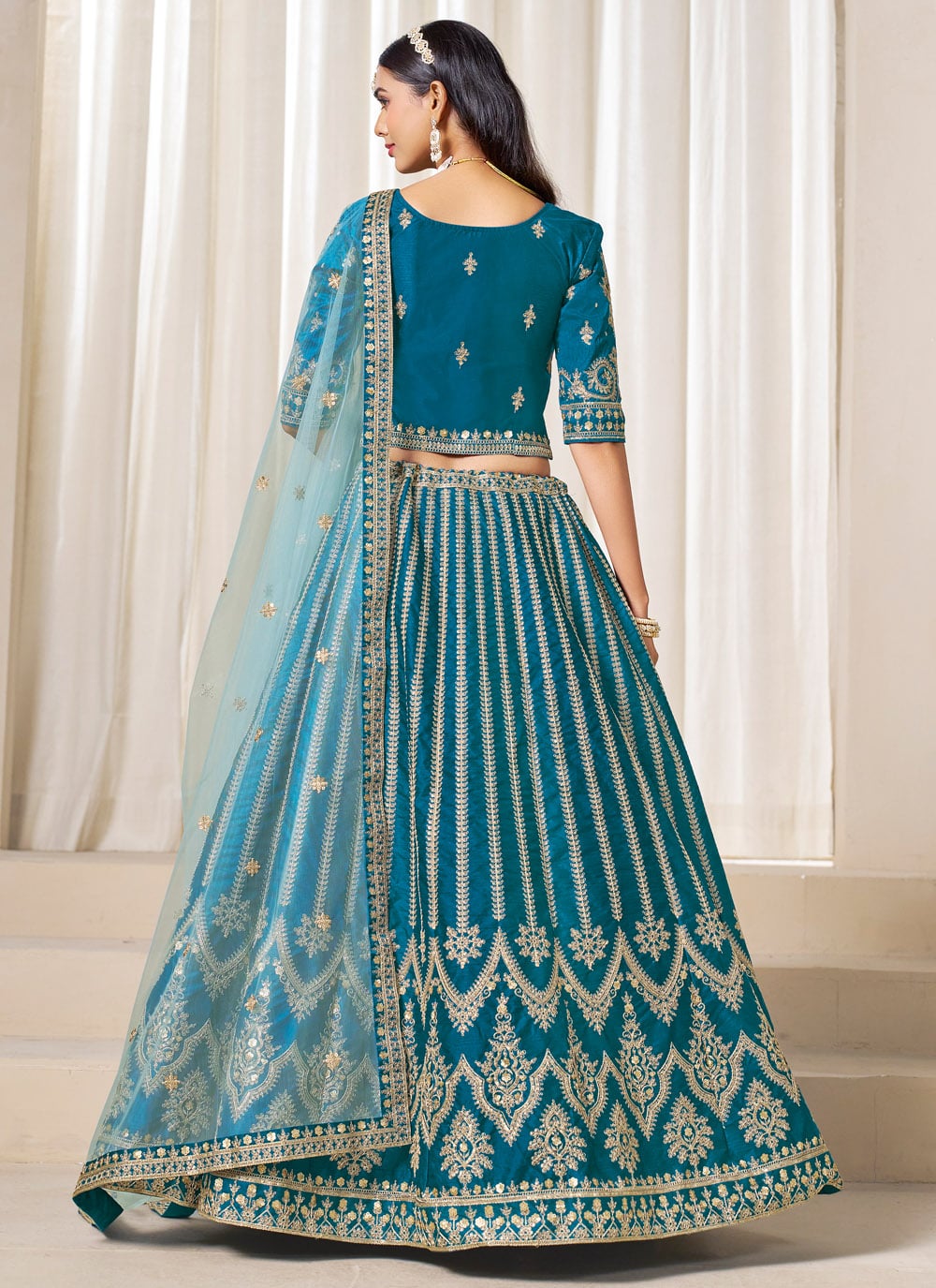 Step into elegance with this Art Silk Sequins Zari Embroidered Lehenga Choli in captivating Rama colour. The lehenga showcases intricate zari work combined with sparkling sequin embellishments, creating a shimmering effect with every move. Ideal for bridal functions, engagement ceremonies or festive gatherings. Comes with matching choli and dupatta.