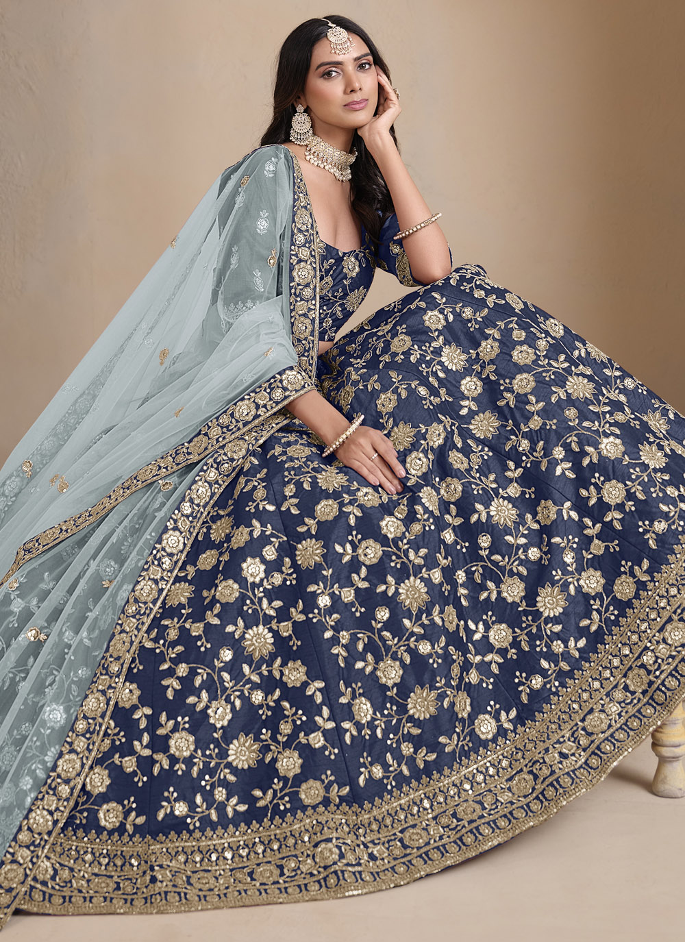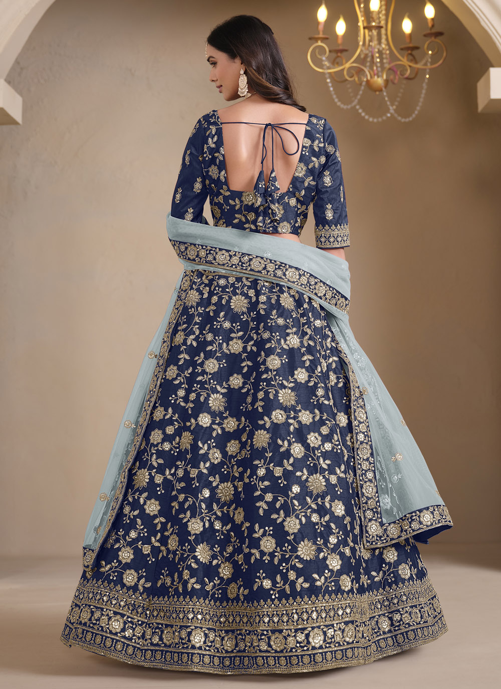 Crafted from smooth art silk, this lehenga choli features delicate handwork using zari and sequins. The teal base brings a refreshing vibrance, while the embroidery enhances the festive charm. Perfect for festive celebrations, weddings, and cultural functions. Comes with matching choli and dupatta.