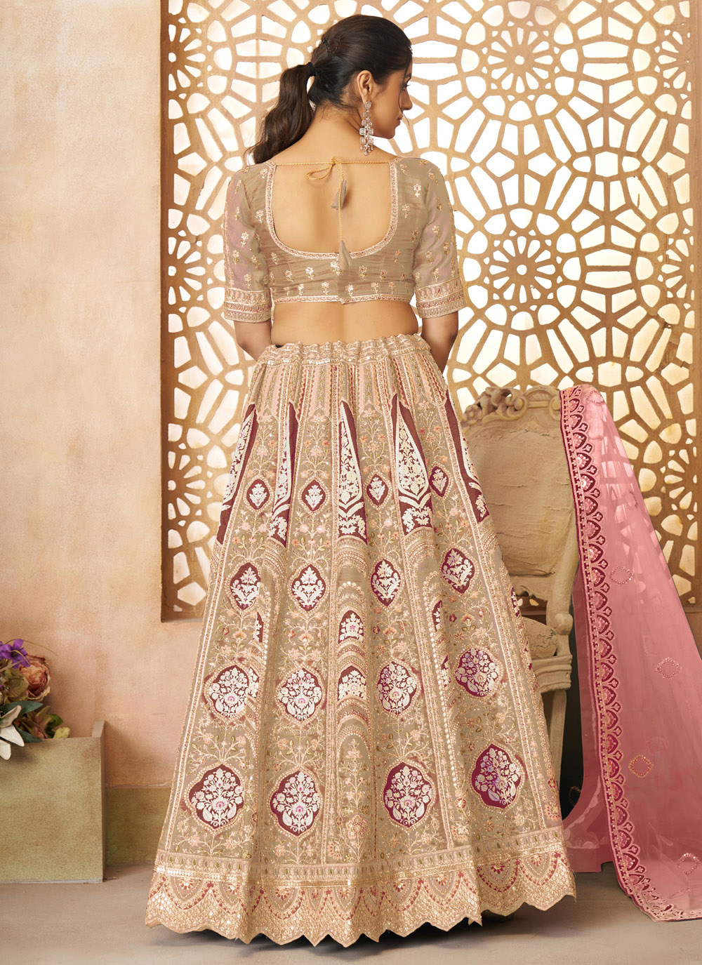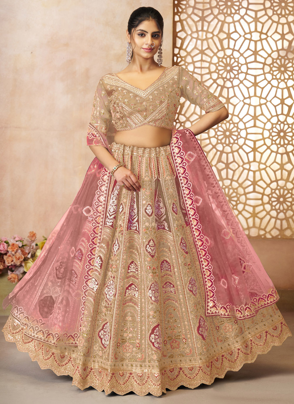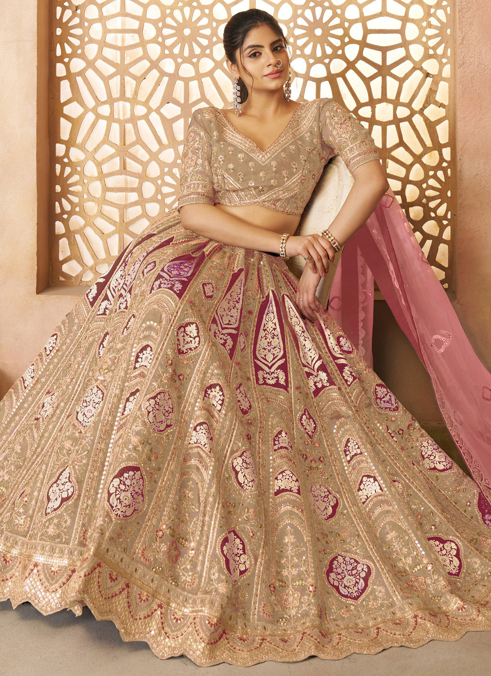 This Banarasi Silk Beige Lehenga Choli captures timeless elegance with intricate zari, sequins, thread embroidery, and shimmering stone work. Its neutral tone and rich textures make it a refined choice for weddings and grand celebrations. Comes with matching choli and dupatta.