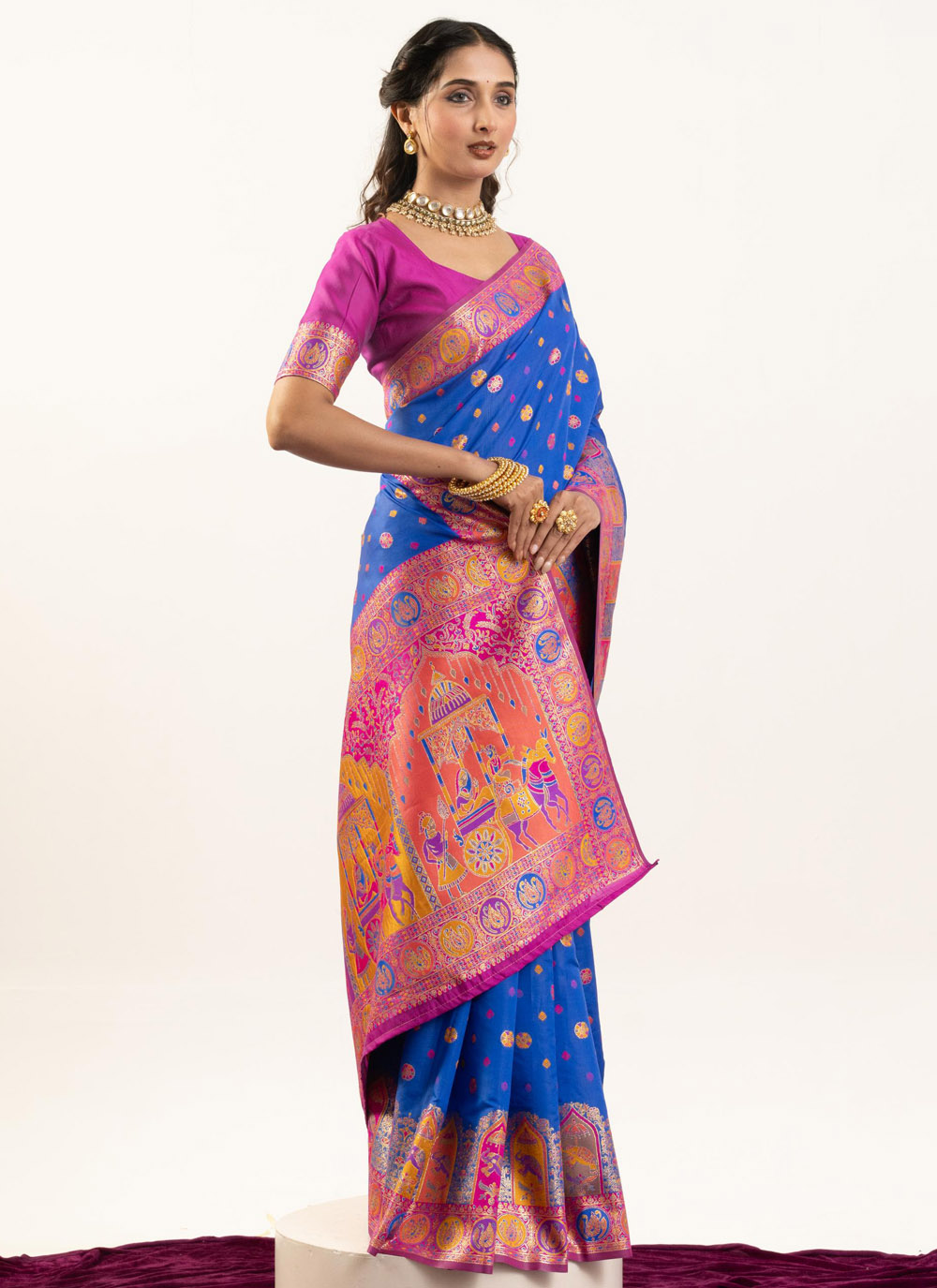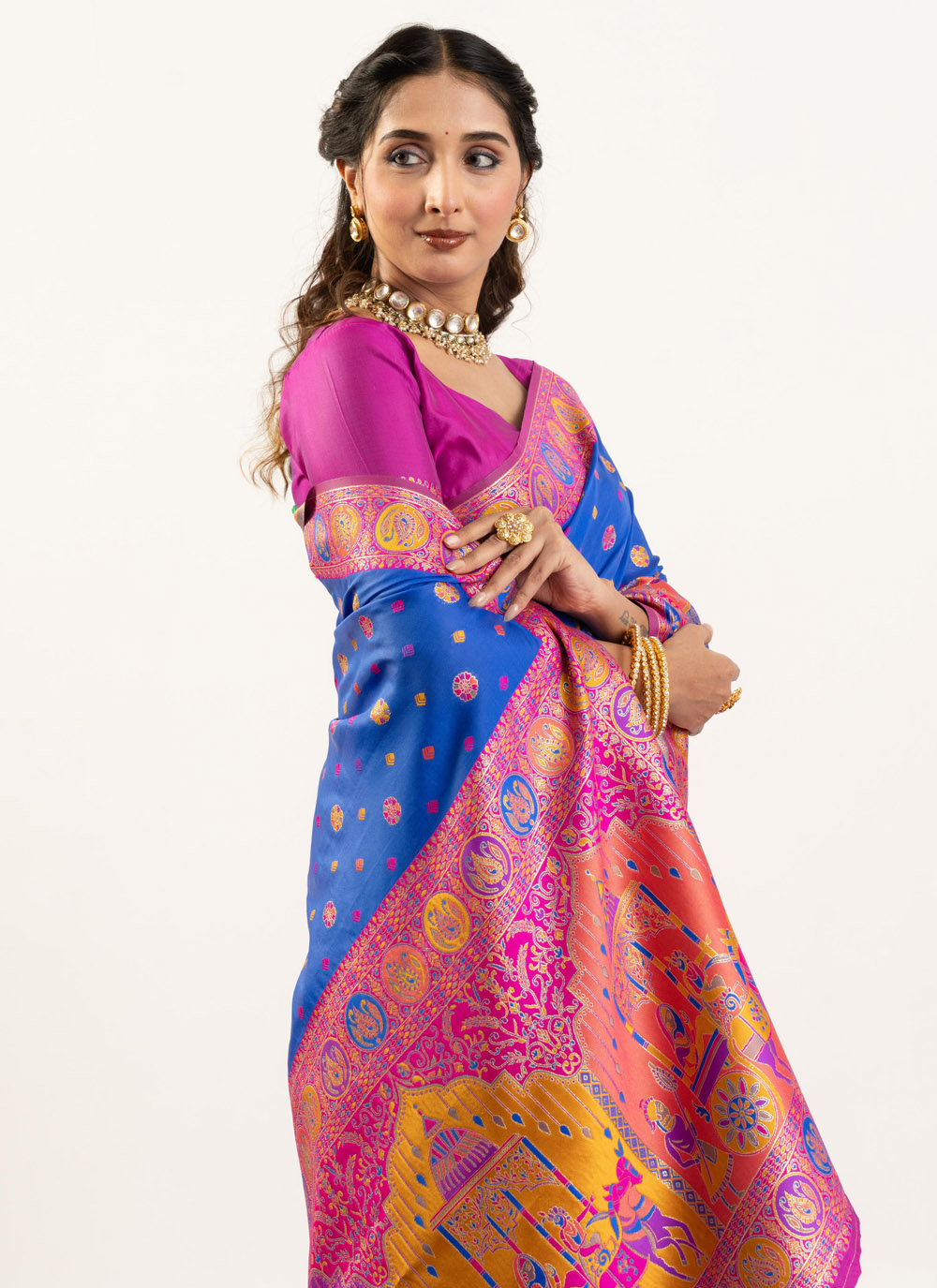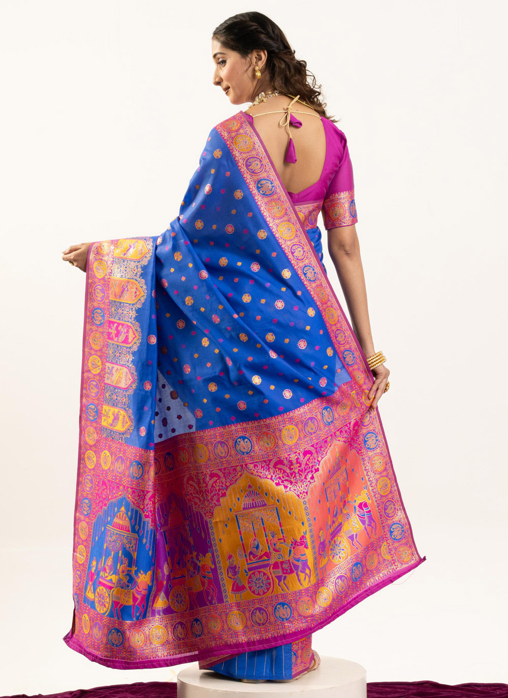 Crafted from premium Banarasi silk, this classic blue saree features intricate Meenakari work that adds depth and vibrancy to every inch. Its smooth flow and elegant sheen make it a must-have piece for timeless ethnic styling. Comes with matching blouse.