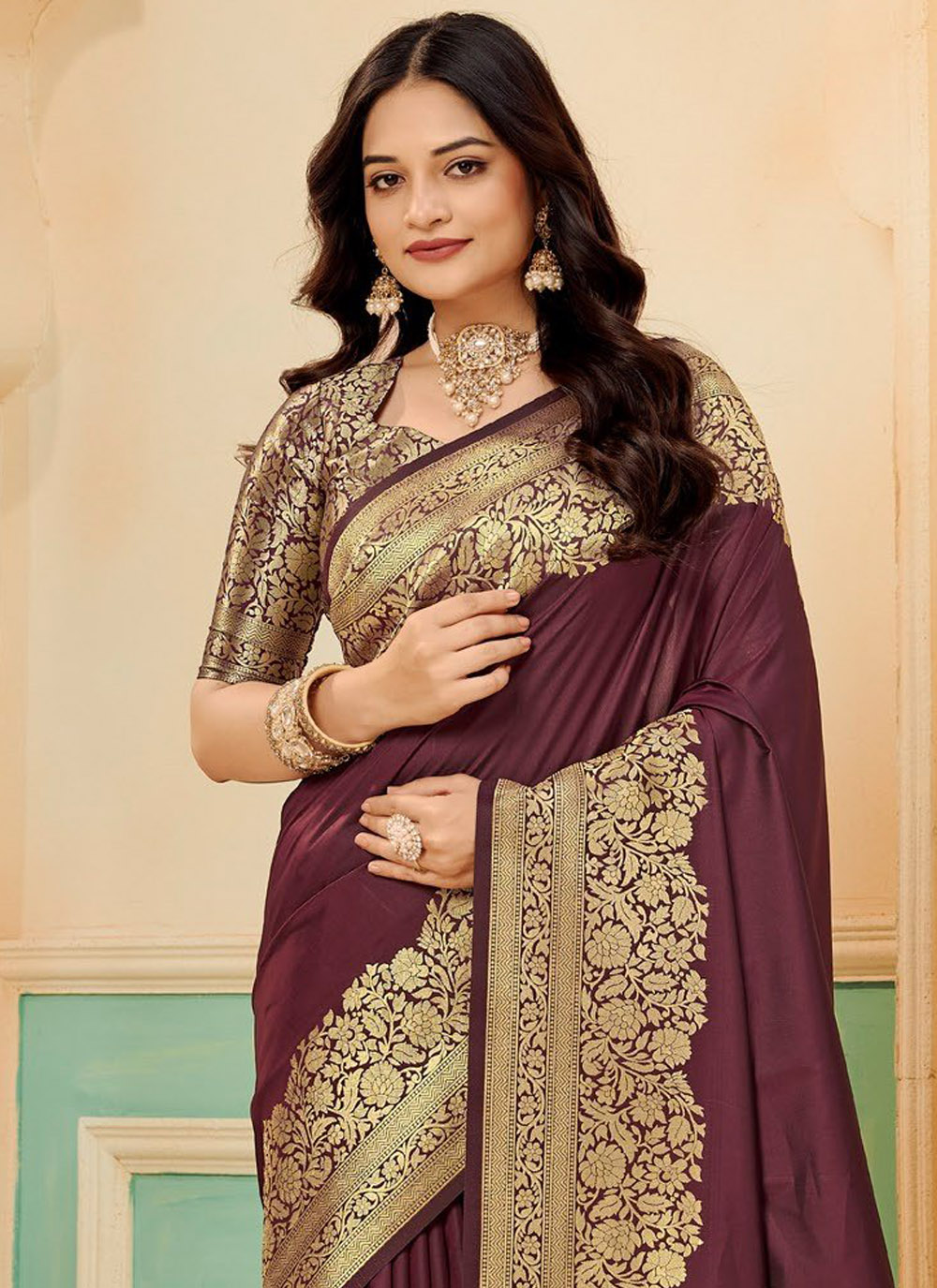 Experience the beauty of traditional craftsmanship with this brown Banarasi silk zari weaving saree. Designed with precision and attention to detail, it offers both comfort and sophistication. Comes with matching blouse.